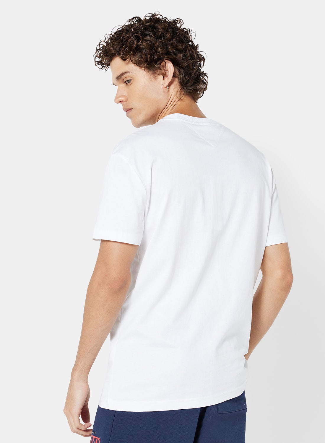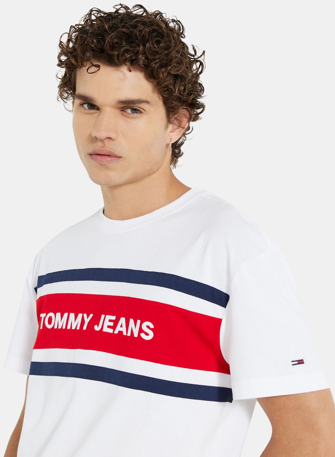 This product features a regular fit made from stretchy organic cotton fabric that has been sustainably sourced. The front panel has a dual tone stripe design that contrasts with the rest of the shirt. It has a crew neck and short sleeves for a comfortable fit. The care label instructions should be followed when washing. The shirt also has an embroidered Tommy Jeans signature branding detail. The model wearing the shirt is approximately 185 cm tall and is wearing a size M.