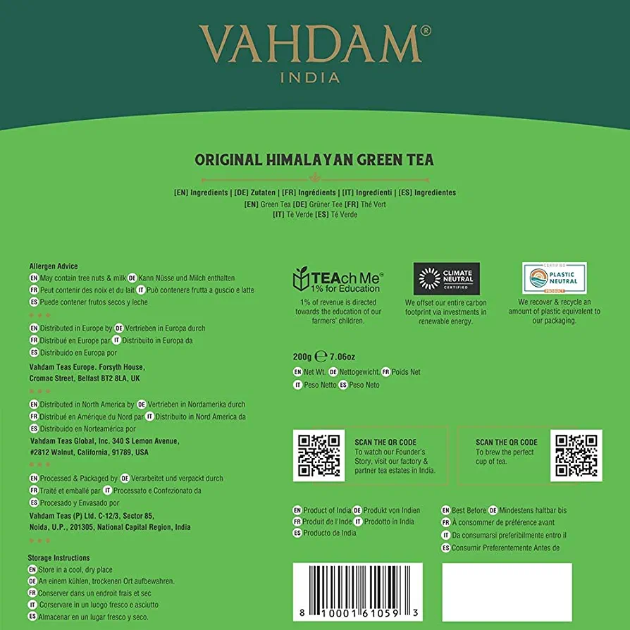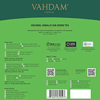 | nameOriginal | VAHDAM, Organic Green Tea Bags from Himalayas (100 Count) Pure Ingredients, Gluten-Free & Non-GMO – Direct from Source in India, Resealable Ziplock Pouch |