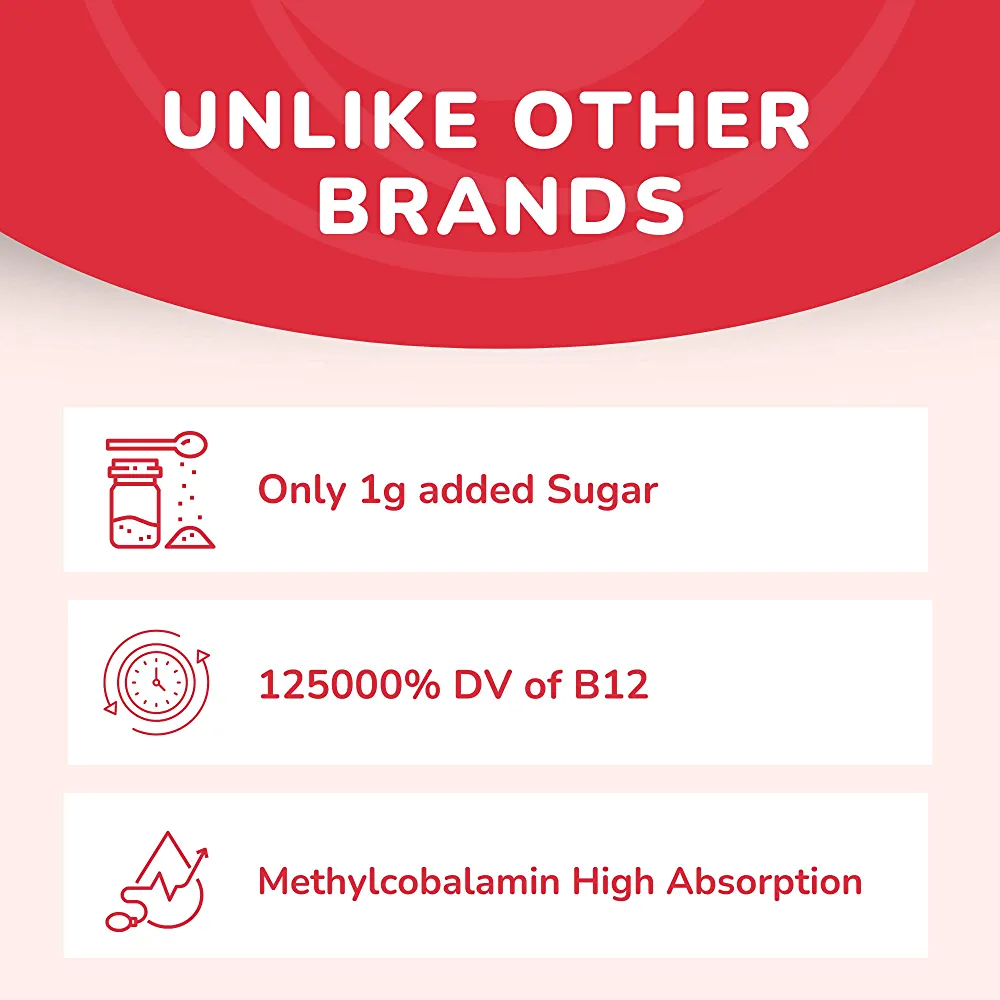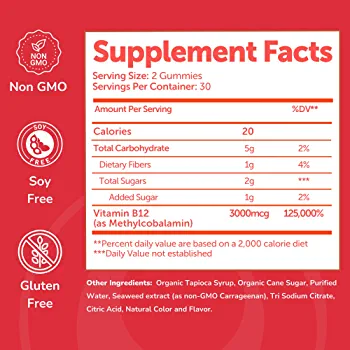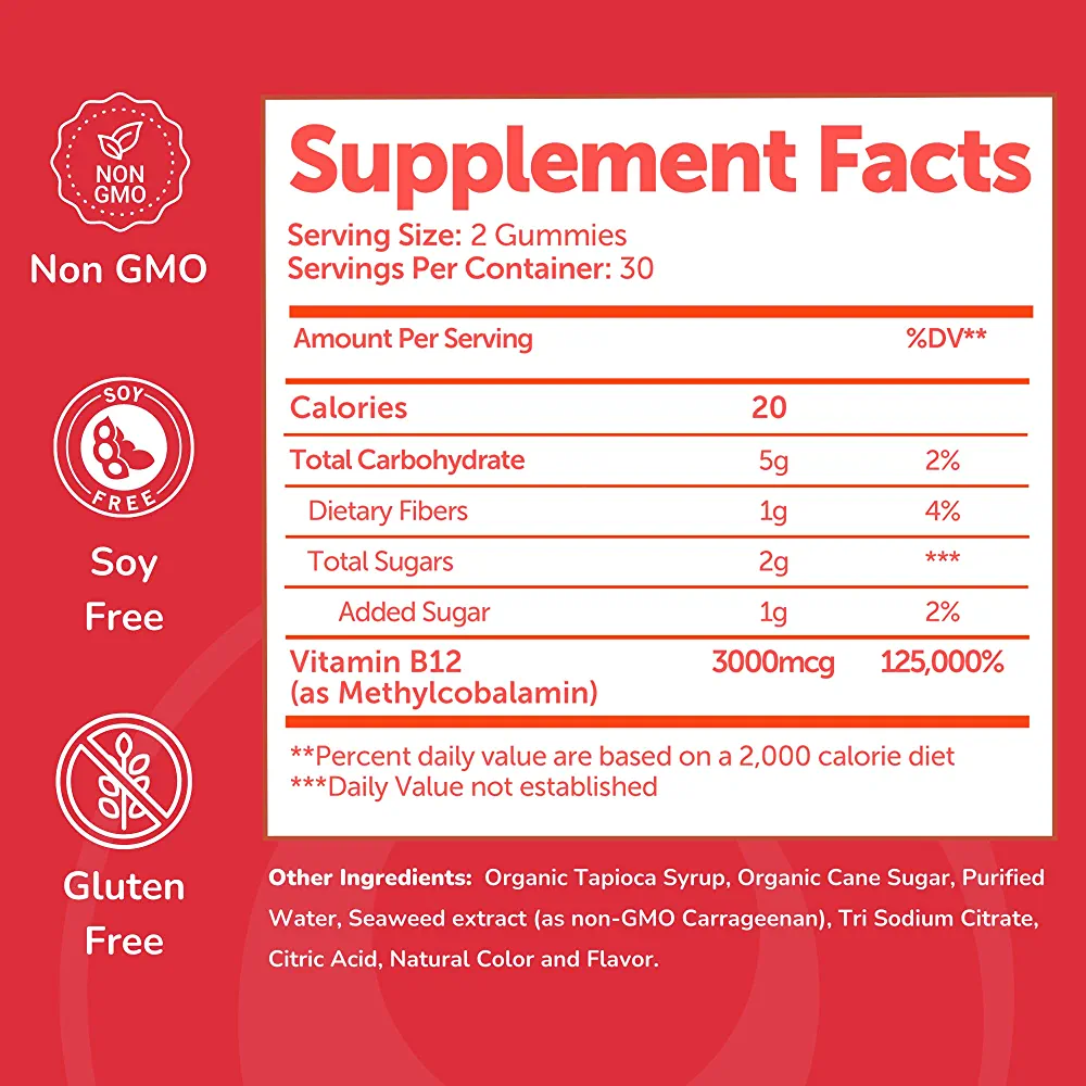 Our Methyl B12 3000 mcg gummies are packed with potency and free from harmful ingredients such as gelatin, gluten, soy, and corn, making them perfect for bone health and red blood cell production.