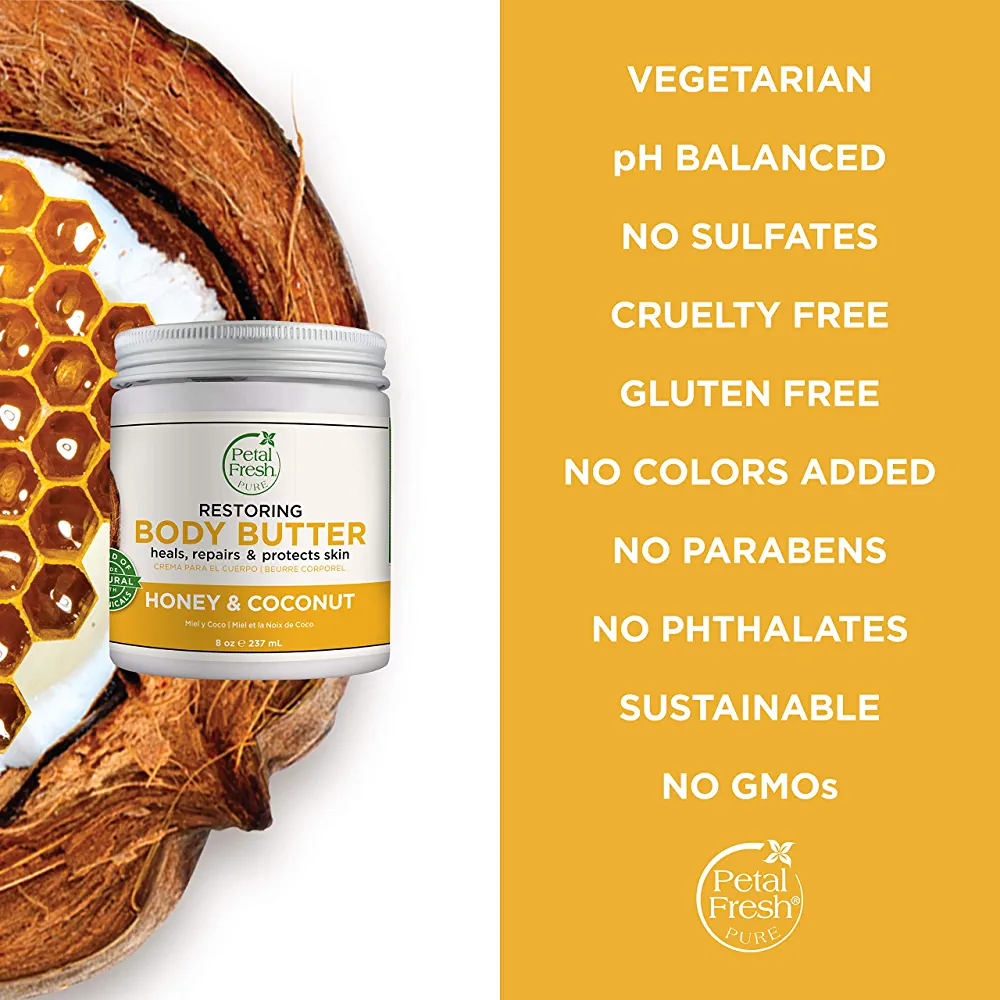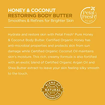 | nameOriginal | Petal Fresh Pure Restoring Honey & Coconut Body Butter, Organic Coconut Oil, Argan Oil, Shea Butter, Intense Hydration, For All Skin Types, Natural Essential Oils, Vegetarian and Cruelty Free, 8 oz |