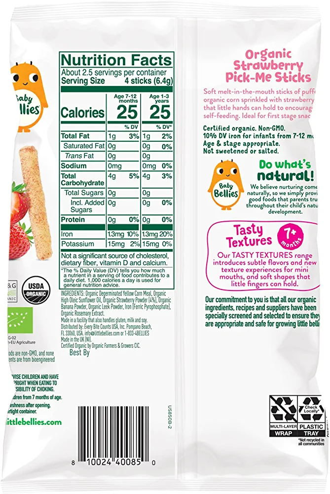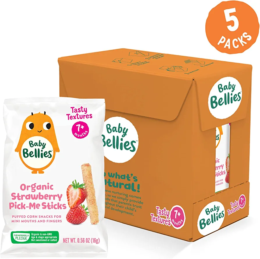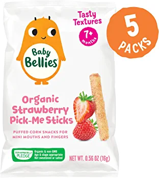 | descriptionOriginal | Description Baby Bellies Organic Pick-Me Sticks Strawberry Puff Snacks from our Tasty Textures range are perfect for tiny taste buds! Deliciously crisp organic corn puff sticks sprinkled with strawberry that melt in the mouth for safe self-feeding are ideal for first-stage snacking. Suitable for babies from 7 months and up, our Tasty Textures range introduces subtle flavors and new texture experiences for mini mouths. The soft puffed corn sticks are just right for tiny hands, and the organic ingredients are perfect for growing Little Bellies. Each bag is 0.56 ounces, great to throw in the diaper bag for an on-the-go snack, or to keep in the pantry at home for those snack time emergencies. |