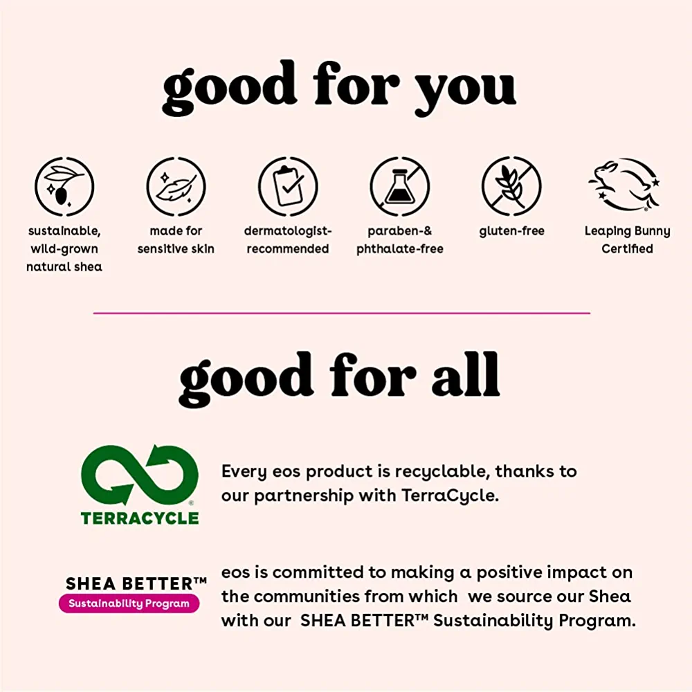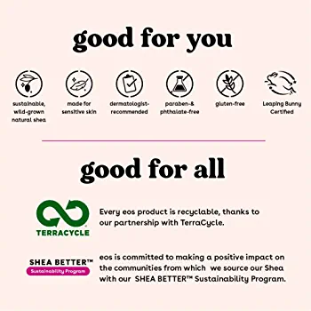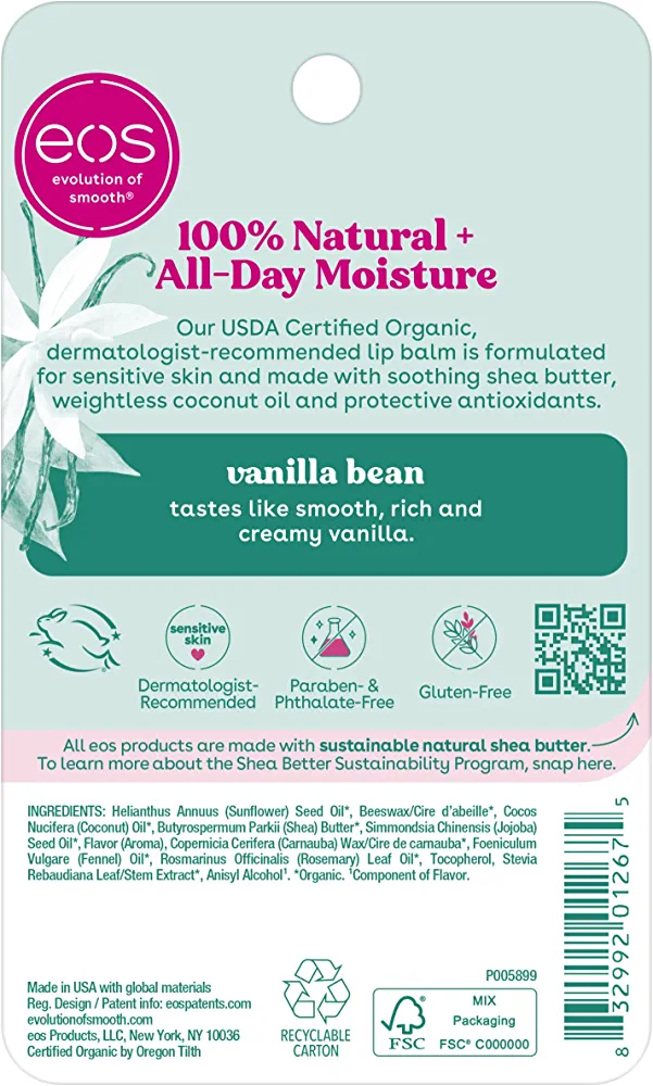 | descriptionOriginal | Description Discover a lip balm that’s 100% natural, organic, and delicious. Our all-natural Vanilla Bean flavor tastes like smooth, rich and creamy vanilla. eos USDA Certified Organic, dermatologist-recommended lip balm is formulated for sensitive skin and made with soothing shea butter, weightless coconut oil, and protective antioxidants. eos lip balms use sustainably sourced ingredients that provide all-day moisture and are sure to leave your lips feeling buttery smooth, hydrated, and with a delicious taste all day long. |