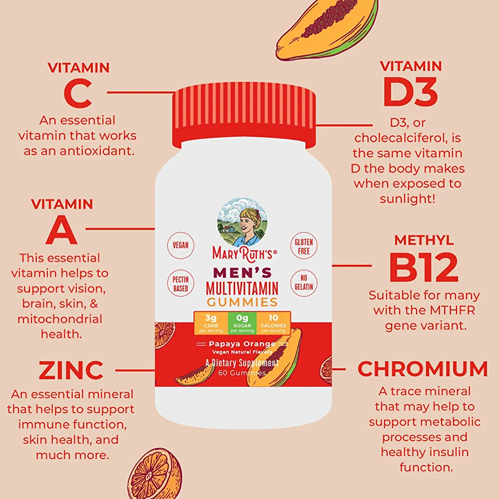Introducing our Men’s Multivitamin Gummies, a vegan and papaya orange flavored supplement designed to provide men with the essential vitamins they need. This powerful blend includes Vitamin A, C, D3, B Vitamins, Iodine, Zinc, and more, ensuring that your body receives the necessary nutrients and ingredients to function at its best.