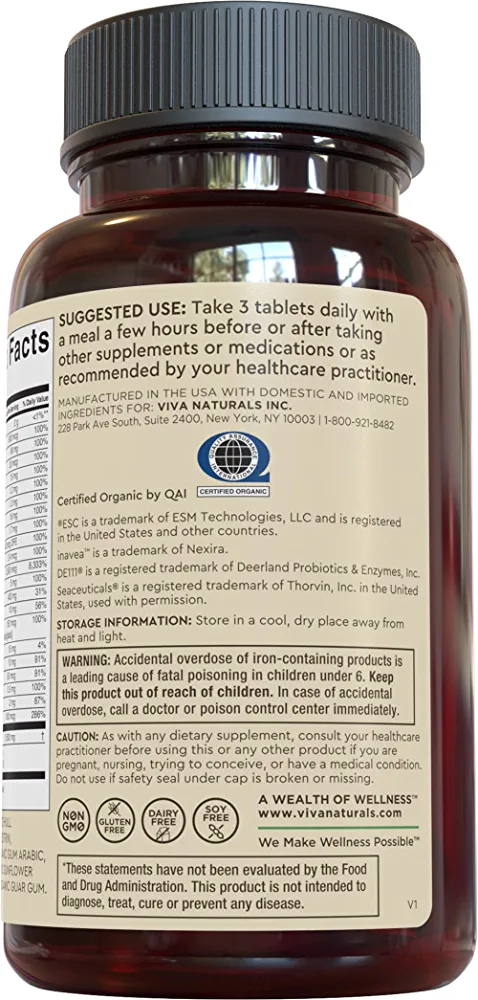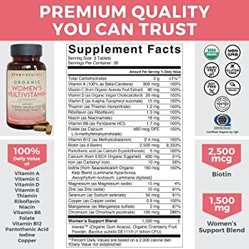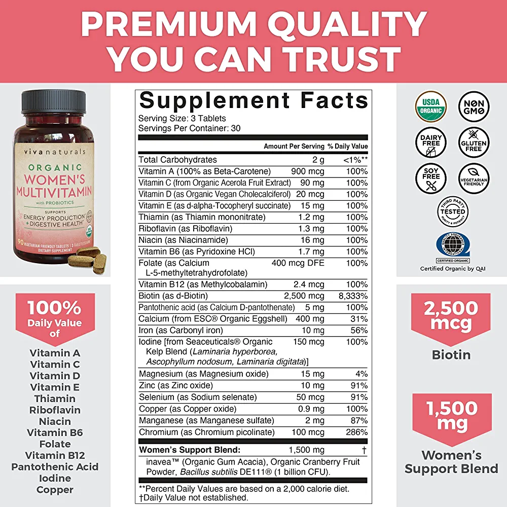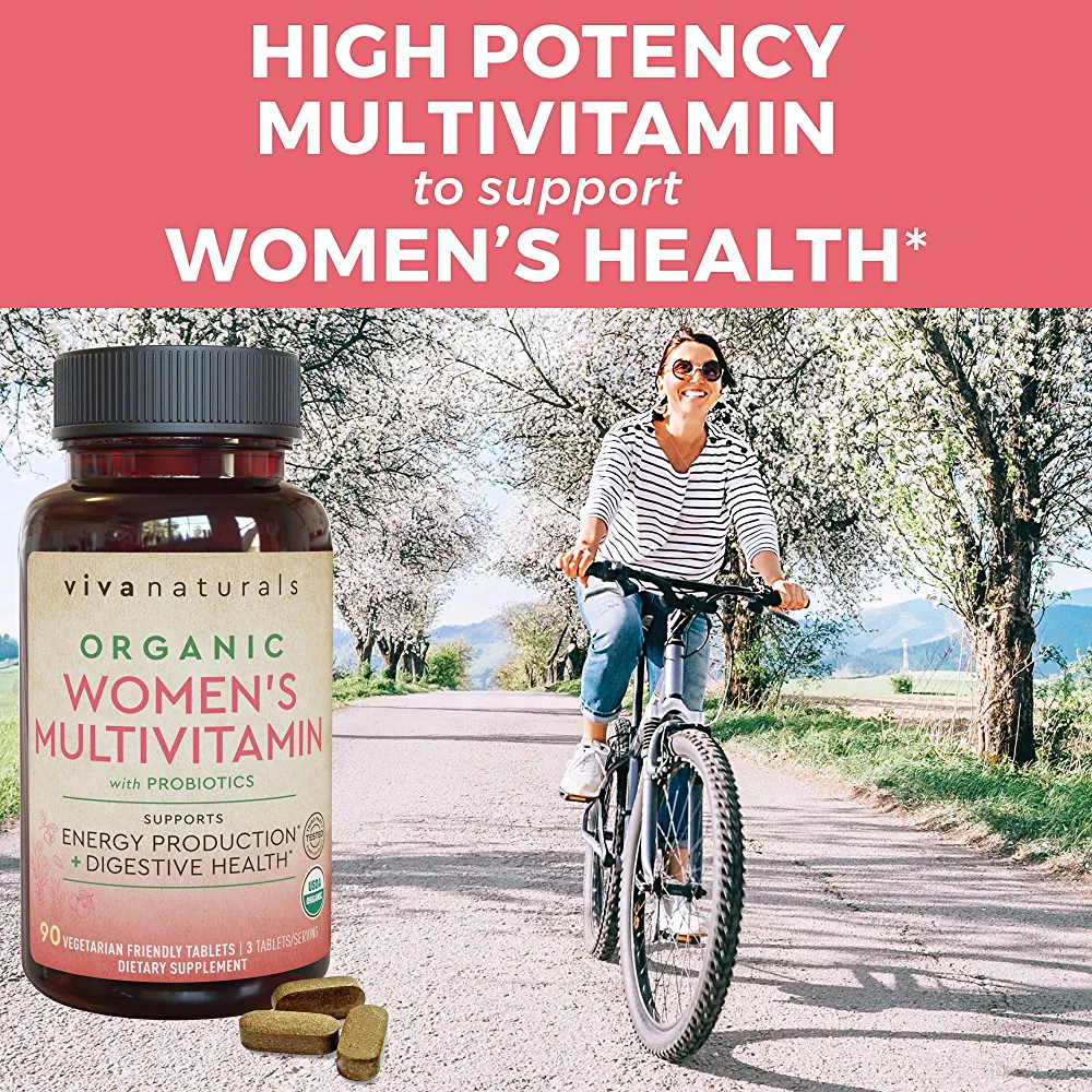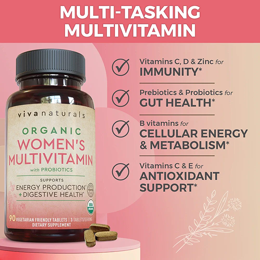 | descriptionOriginal | Description A complete multivitamin specially formulated to support women’s needs, Viva Naturals Organic Women’s Multivitamin is an all-in-one supplement designed to support female health.* Our organic vitamins are packed with 20 essential vitamins and minerals, including Vitamin A, B, C, D, and E, plus iron, calcium, folate and zinc. Unlike many nutritional supplements, this multivitamin provides 100% of your daily recommended intake of 15 different essential nutritents. These womens daily vitamins are formulated to support energy production, immune health, skin health, bone health, and radiant hair and nails.* Plus, we’ve packed our multi vitamins supplements for women with a digestive blend that includes 1 Billion CFUs probiotics and an organic prebiotic fiber that helps support balanced digestion.* This all-in-one multivitamin for women with iron is delivered in vegetarian-friendly organic tablets, made without GMOs, gluten, dairy and soy. If you’re looking for vitamins and supplements to support women’s-specific health needs, we’ve got you covered.  |