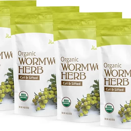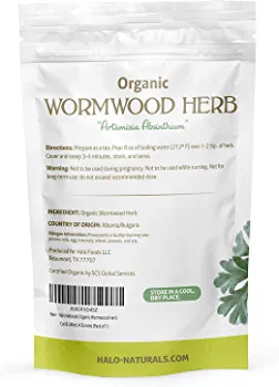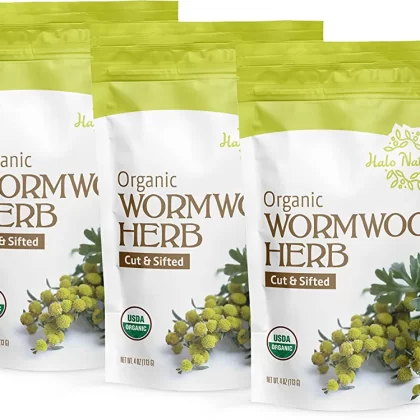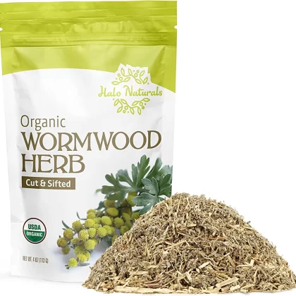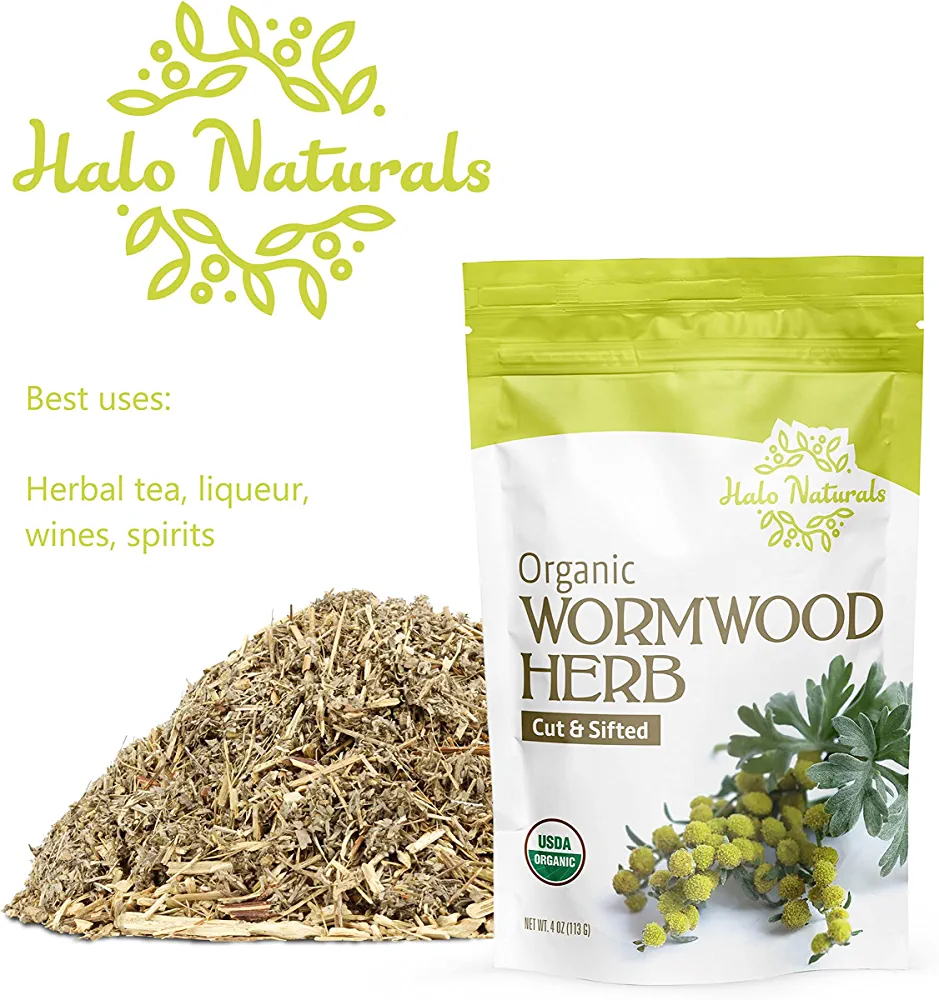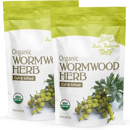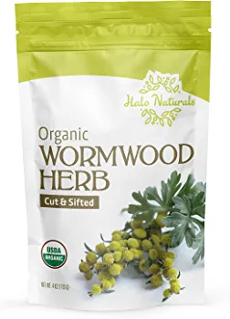 | nameOriginal | Halo Naturals Organic Wormwood Herb 4 oz Cut & Sifted (Artemisia absinthium) USDA Certified Organic Wormwood Tea, Non-GMO, Vegan, Resealable Pouch, Packaged in the USA (4 Ounces (Pack of 1)) |