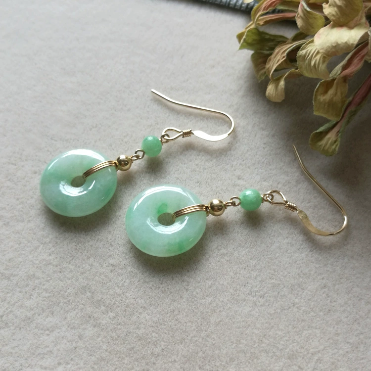 Original 14k gold-filled natural jade A-grade safe buckle jade earrings light green floating flower earrings long feminine style