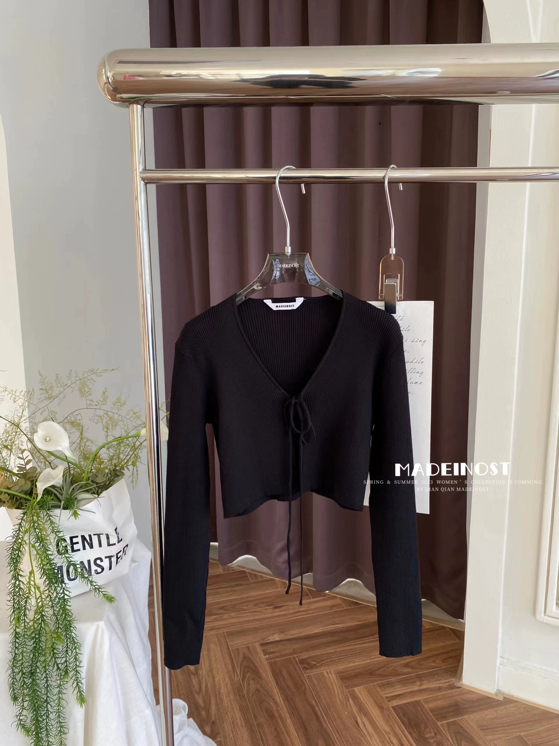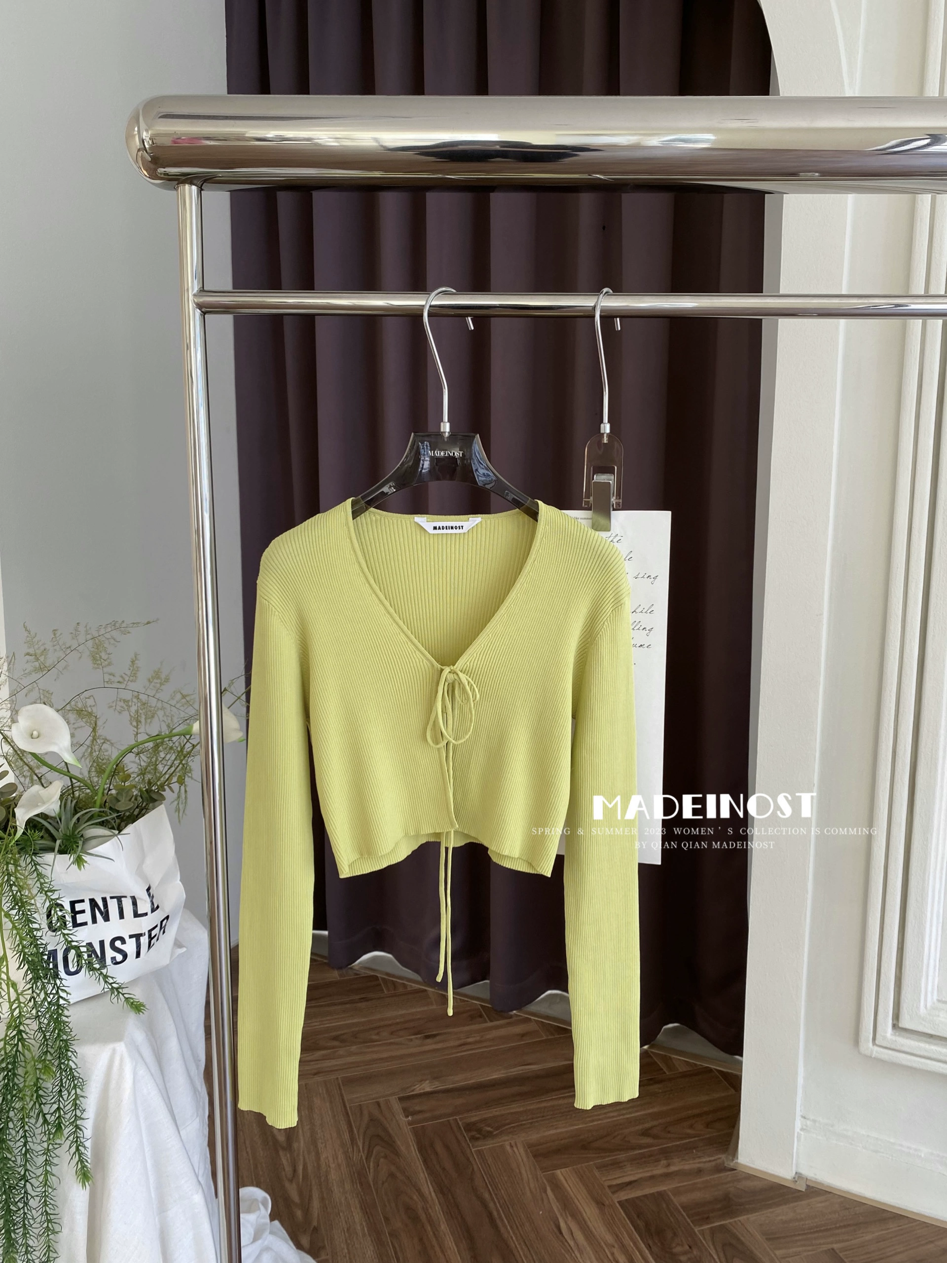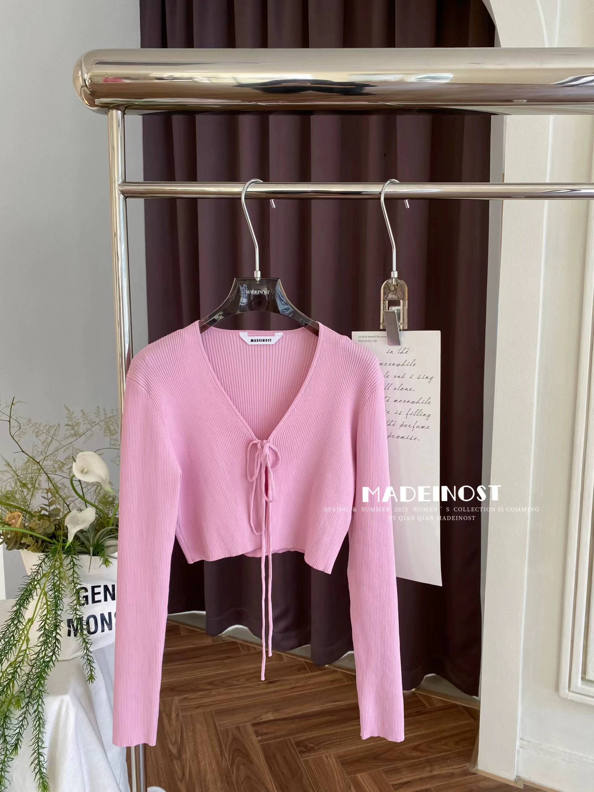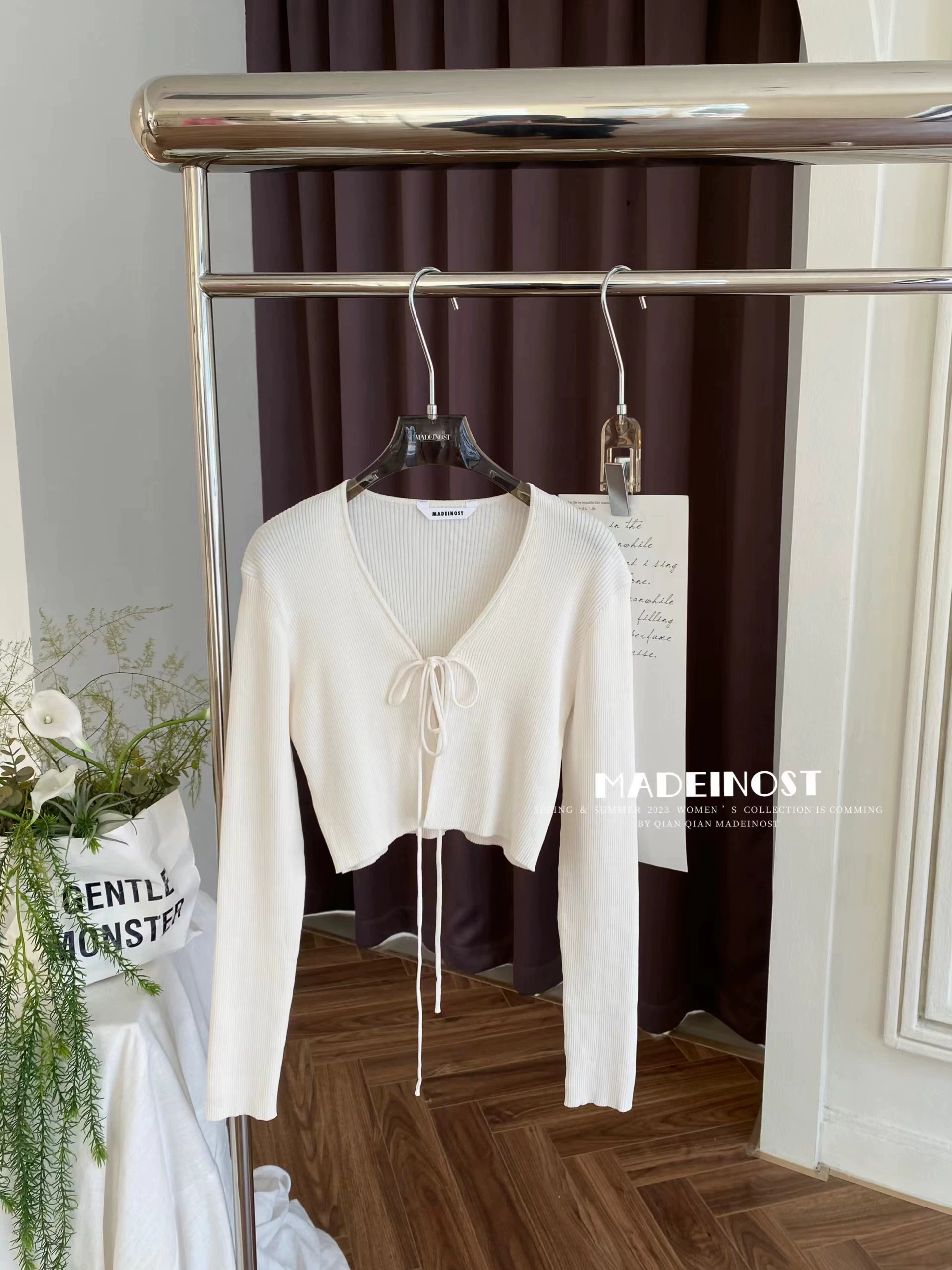 Original design V-neck strapped ice silk knitted cardigan