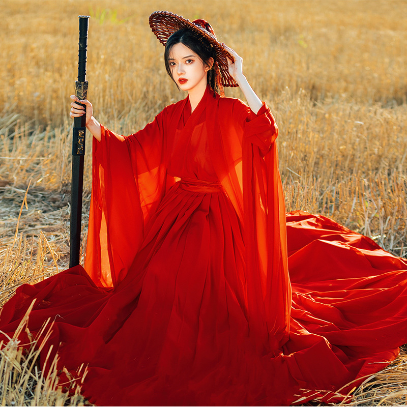 Original Hanfu women's red martial arts ancient costume Wei and Jin style wide sleeve flow fairy skirt fairy cross collar improved big sleeve shirt Spring