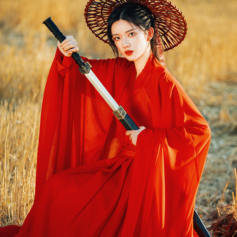 Original Hanfu women’s red martial arts ancient costume Wei and Jin style wide sleeve flow fairy skirt fairy cross collar improved big sleeve shirt Spring