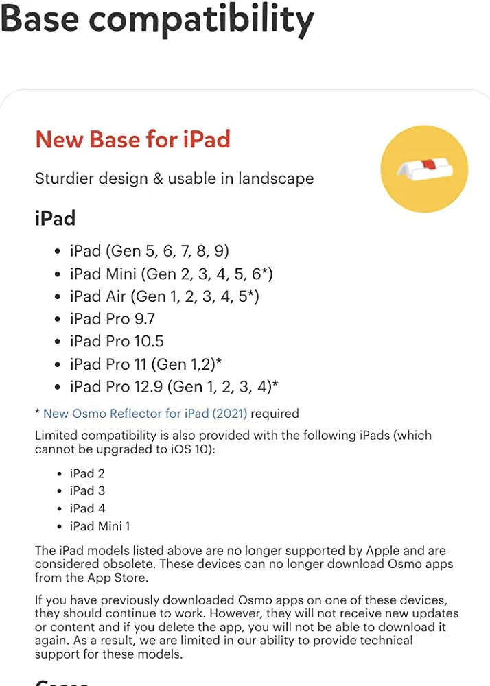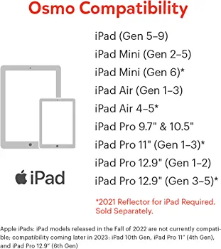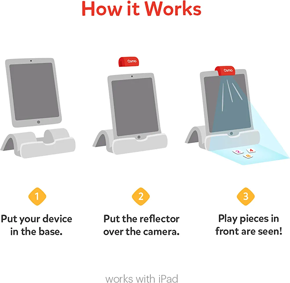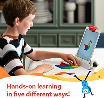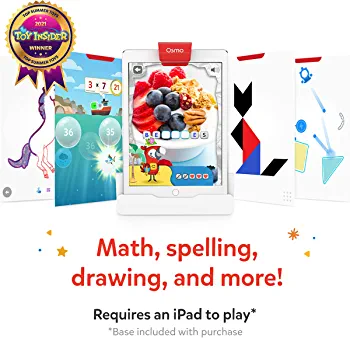 Osmo Genius Starter Kit for iPad includes 5 educational games for ages 6-10, covering math, spelling, creativity, and more. The STEM toy comes with an Osmo iPad base.