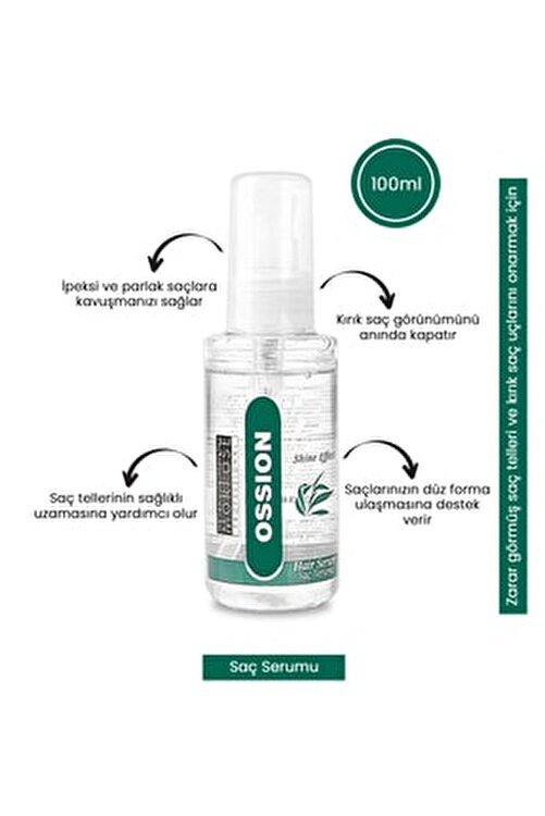 Ossion Hair Serum 100 ML It is a hair serum specially formulated to repair damaged hair strands and broken hair tips. It is a very practical hair care product that allows you to achieve healthier looking hair by creating a shiny effect. What Does Ossion Hair Serum Work For? It allows you to get silky and shiny hair. Instantly closes the appearance of broken hair. Supports your hair to reach a flat shape with daily use. Helps hair strands grow with health. How to Use Ossion Hair Serum? It is applied to clean, damp or wet hair. Squeeze some product into your palm. After spreading it on your hand, smear it on all hair, especially the ends of the hair. No rinsing required. Suitable for use by people over 3 years old.