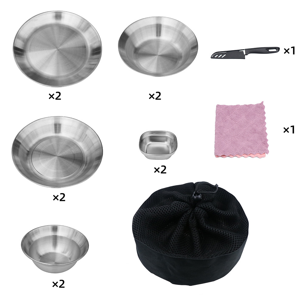 Outdoor stainless steel plate 12-piece set camping tableware suit self-driving tour convenient barbecue plate household basin dishes