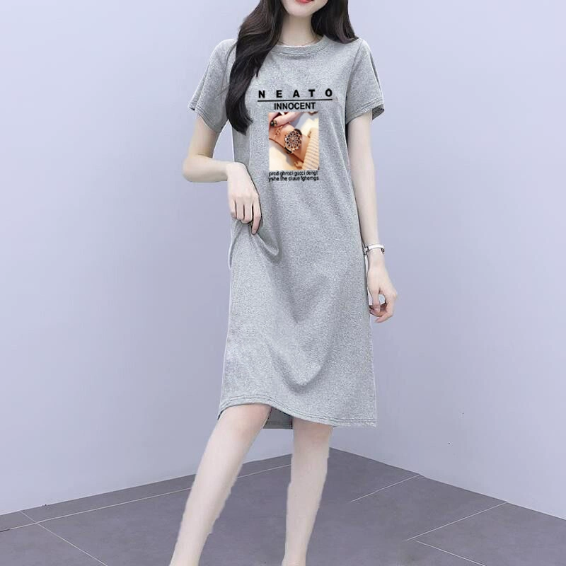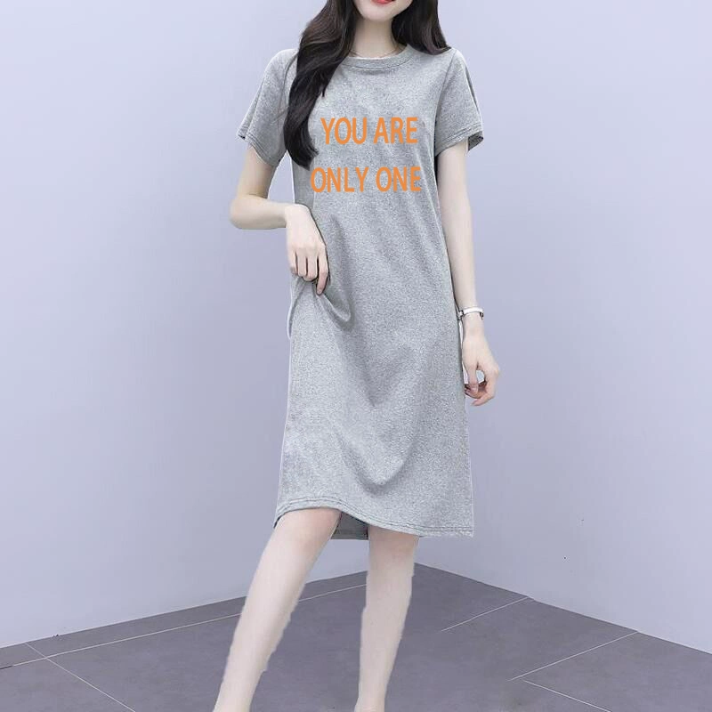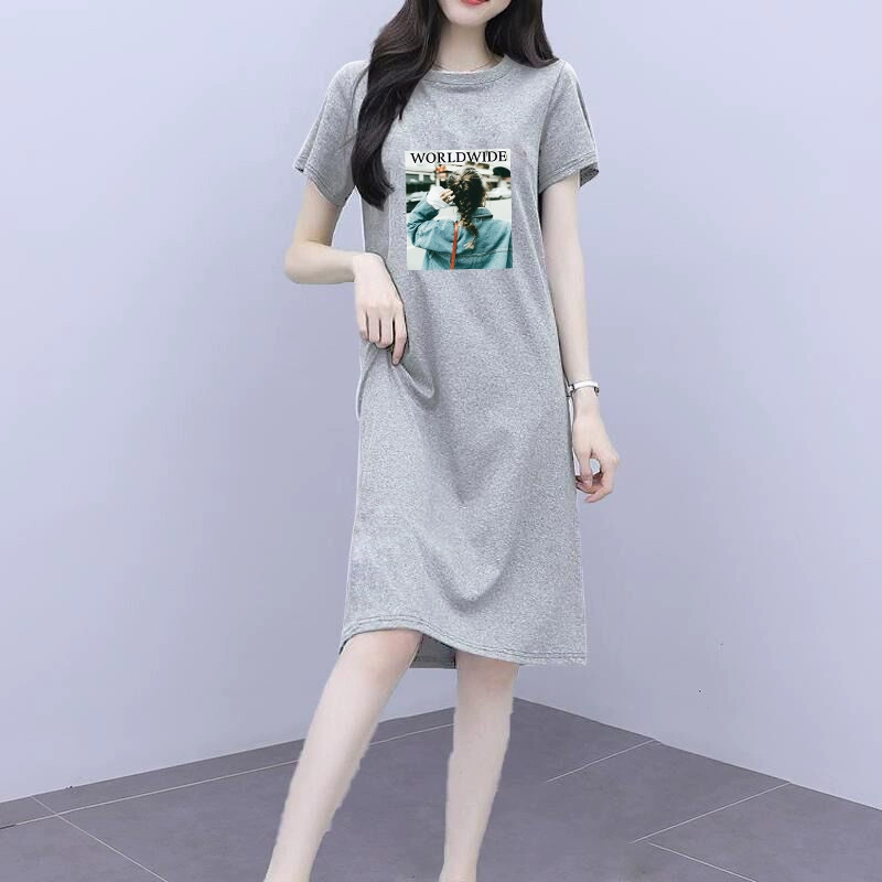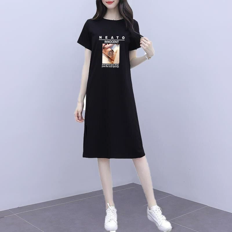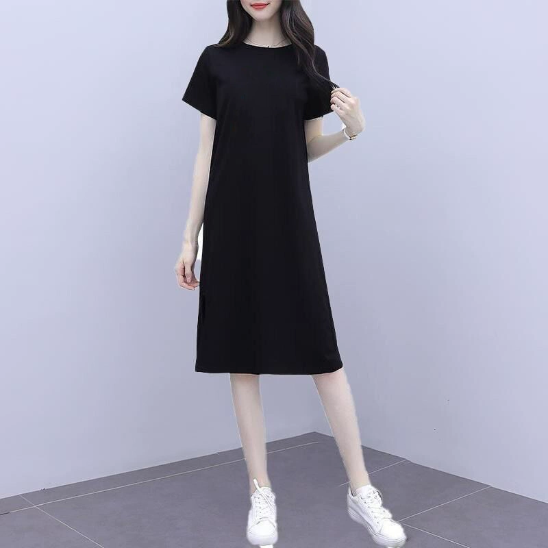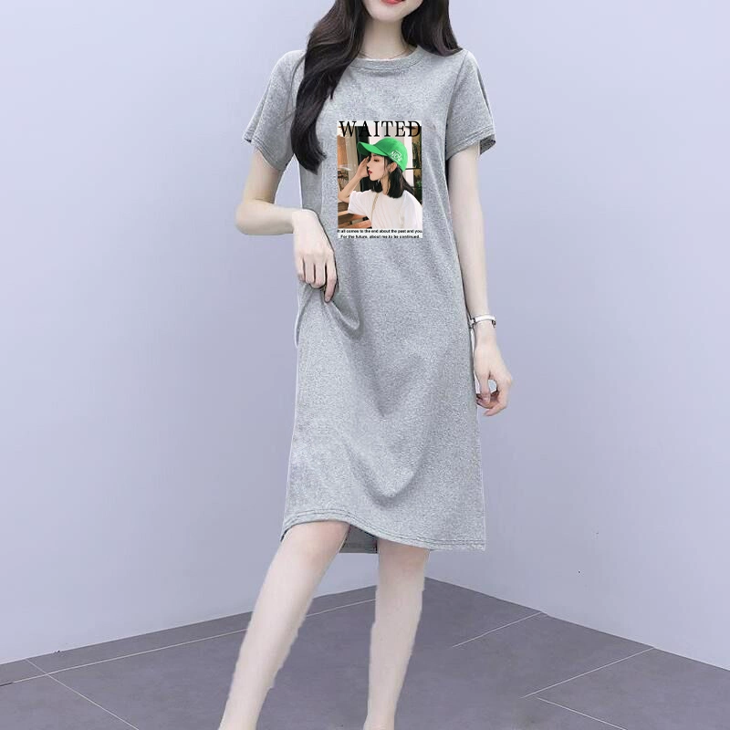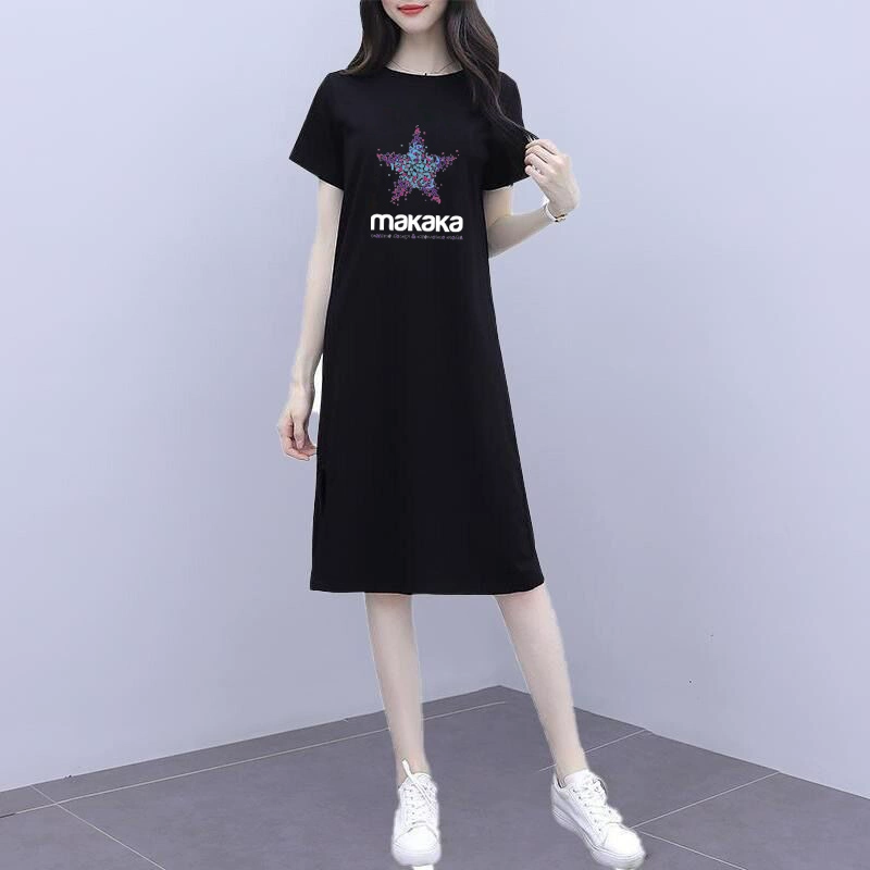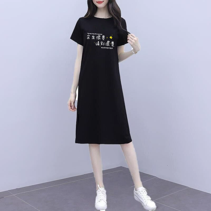 Over-the-knee temperament dress 2024 summer Korean style short-sleeved T-shirt for fat mm, loose and slim women's casual mid-length skirt
