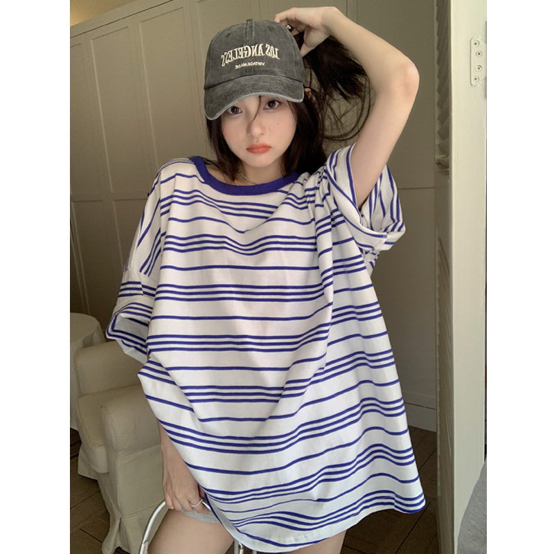 | nameOriginal | Oversize striped short-sleeved T-shirt for women in summer, mid-length loose bf lazy style casual all-match half-sleeved top |