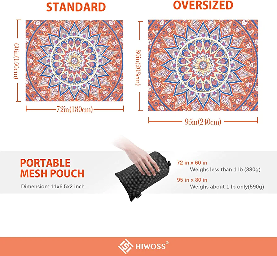 Our beach mat is not only portable and thin, but also durable. It comes folded in a compact mesh bag and weighs less than 1 pound for the 71”×60” size and about 1 pound for the 95”×85” size. It’s perfect for picnics, open-air festivals, sporting events, camping, hiking, fishing, or even as an outdoor tablecloth.