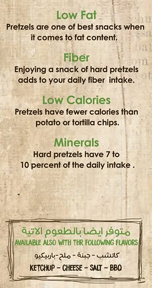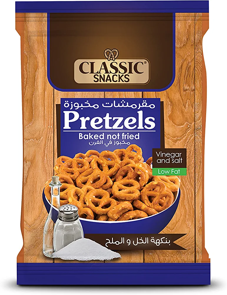 | nameOriginal | Classic Snacks' Vinegar and Salt Pretzels, 100% Baked Snack, Low Fat and Calorie Snack – 30gm x 10 (Pack of 10) |