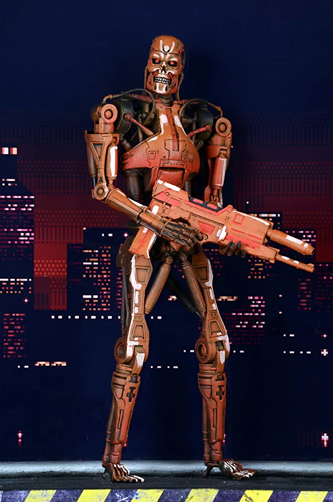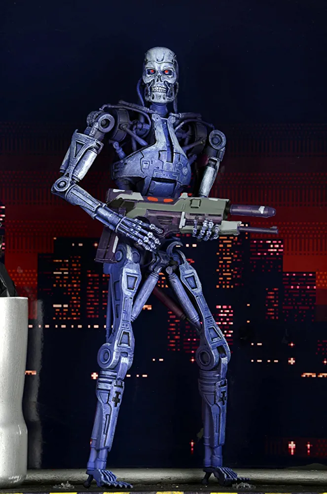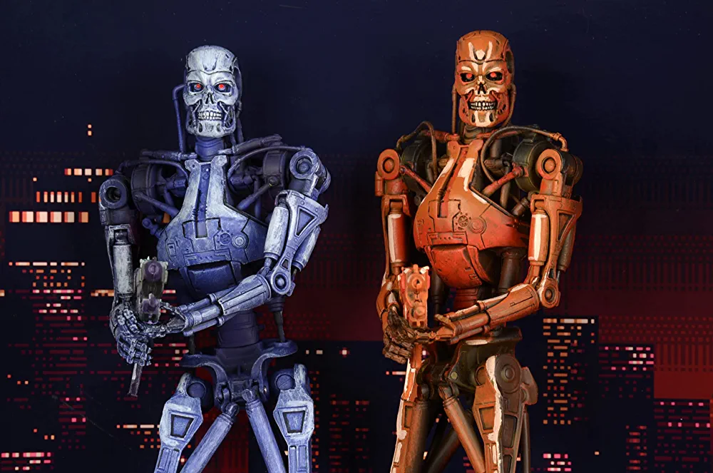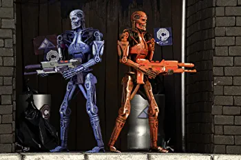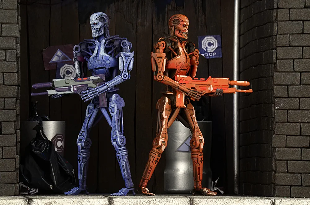 The Robocop figure features his iconic silver and black armor, complete with his signature gun and interchangeable hands for different poses. The Terminator Endoskeleton figure is also highly detailed, with a metallic finish and glowing red eyes.