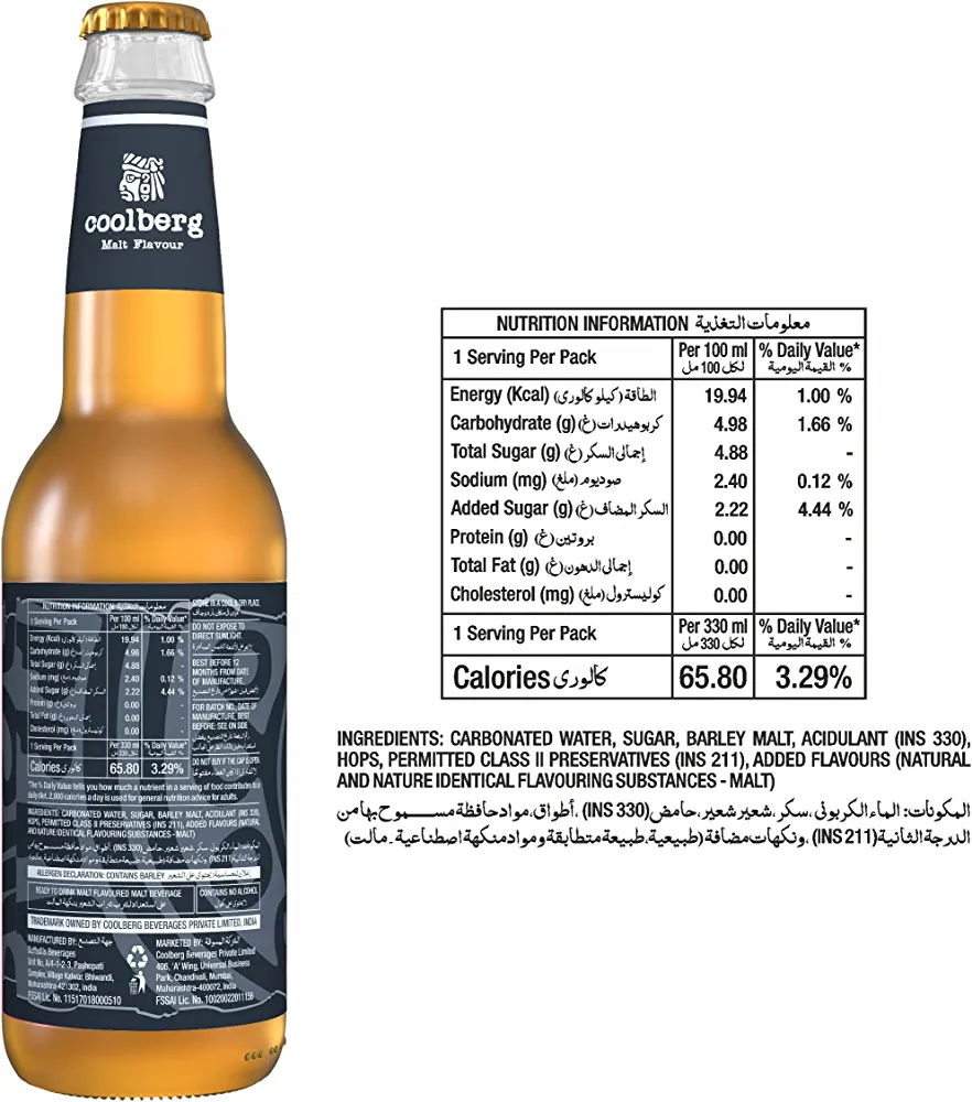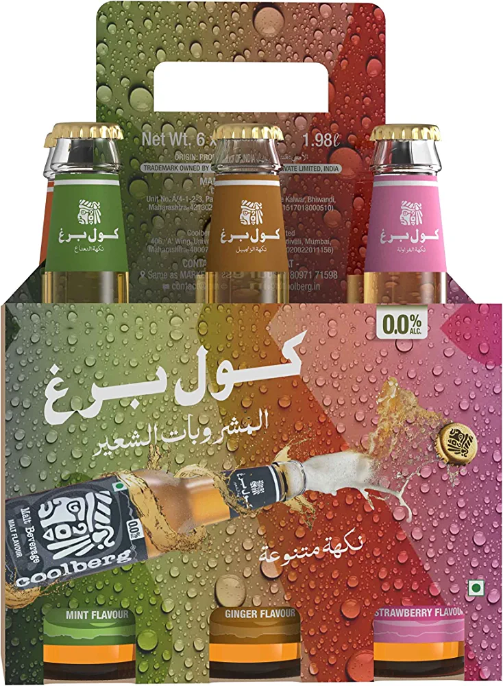 | nameOriginal | Coolberg Non-Alcoholic Beverage Assorted Flavours 330ml Glass Bottle – Pack of 6 (330ml x 6) Peach, Mint, Malt, Cranberry, Ginger & Strawberry |