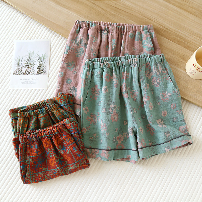 Pajama Pants Women’s Summer Pure Cotton Gauze Shorts Vintage Yarn-dyed Printed Home Pants Thin Loose Beach Pants for Outer Wear