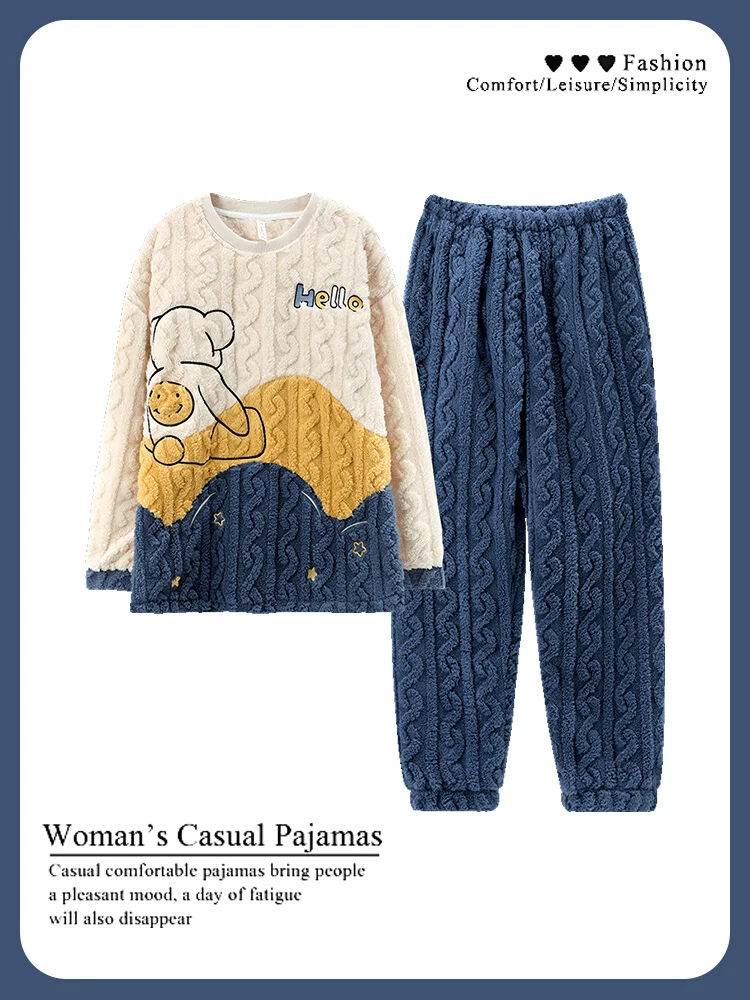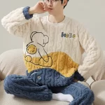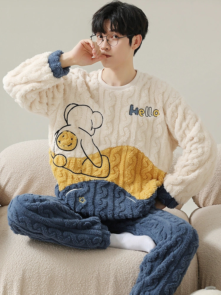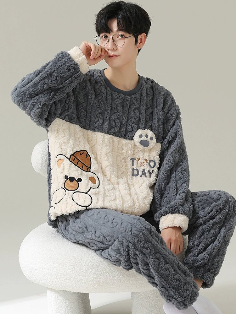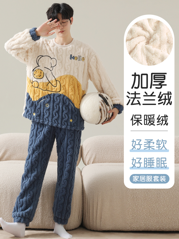Pajamas for men winter men’s coral velvet plus velvet thickened flannel winter suit color matching home clothes autumn and winter