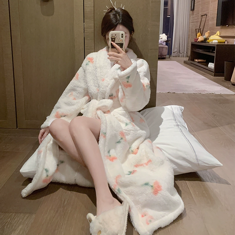 | nameOriginal | Pajamas for women in autumn and winter coral velvet warm plus velvet thickened cardigan that can be worn outside sweet floral flannel home clothes |