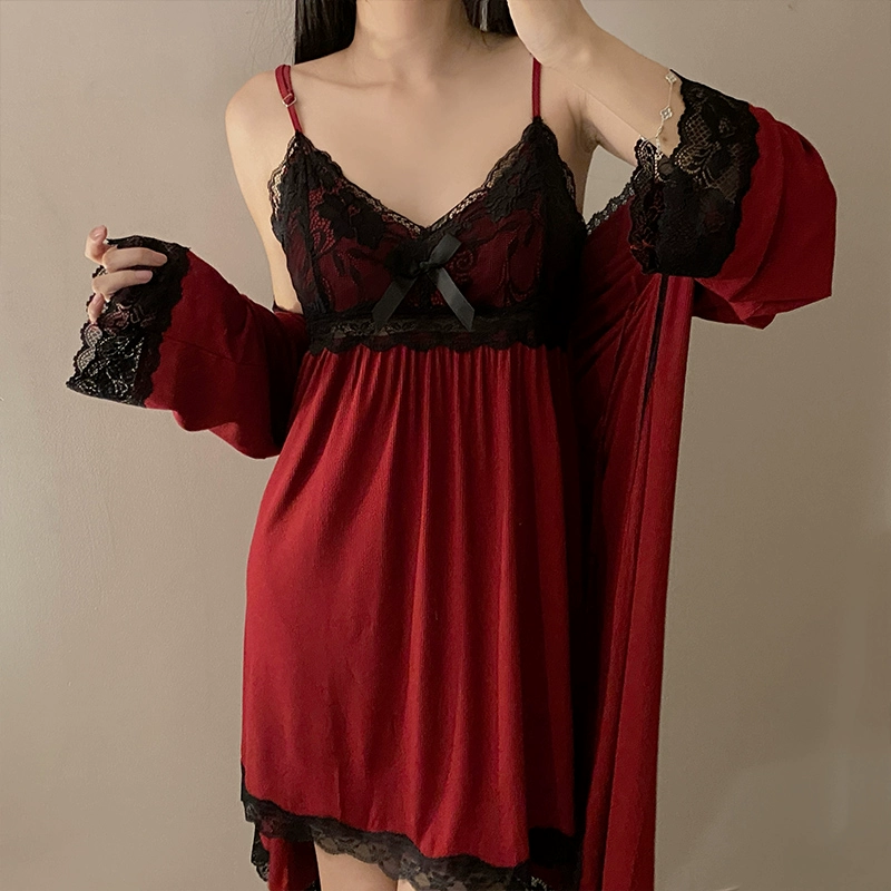 Pajamas female Modal suspender nightdress women’s summer bed robe lace sexy thin pure cotton net red wind home clothes