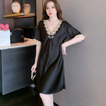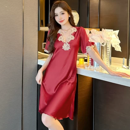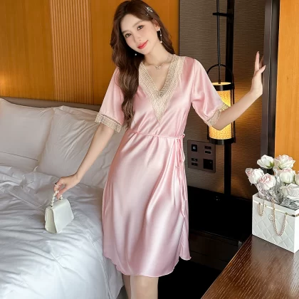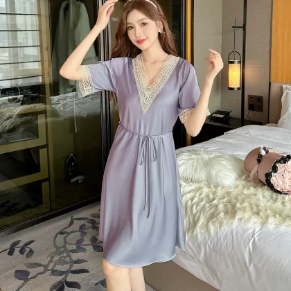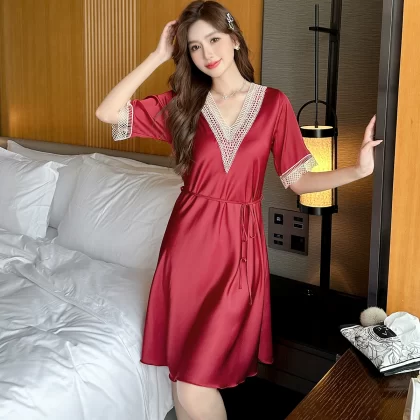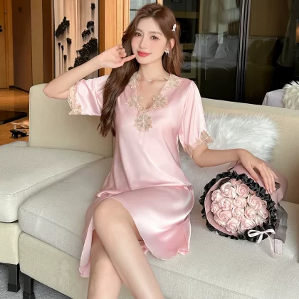 Pajamas for women, summer ice silk thin nightgown, sexy loose short-sleeved summer silk internet celebrity high-end home wear