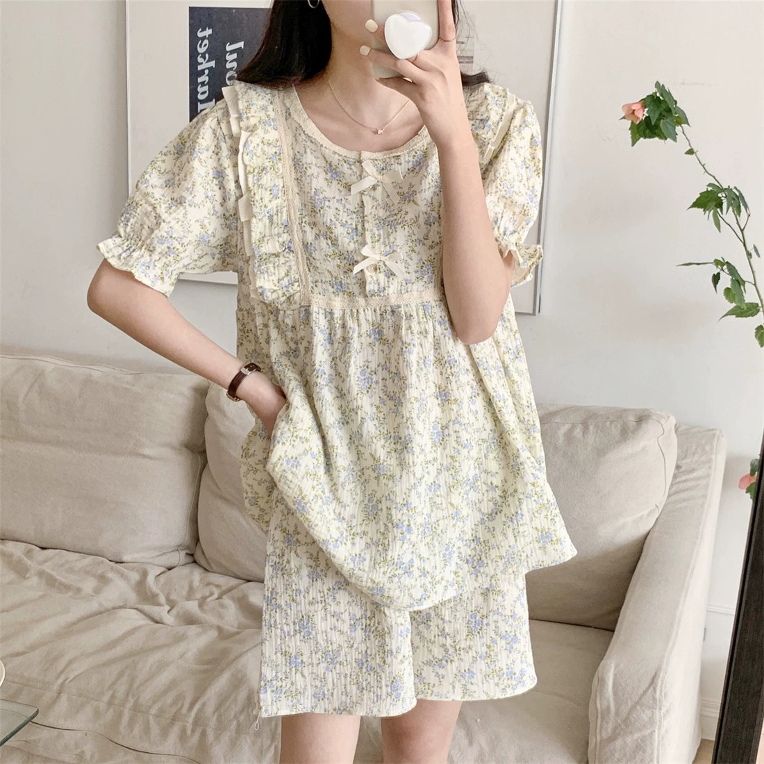 Pajamas for women in summer shorts and shorts Korean version sweet and cute little bear pure cotton gauze home clothing two-piece set day