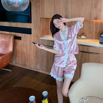 | nameOriginal | Pajamas for Women Summer Thin Simulated Silk Short Sleeves Sexy Ice Silk Lace Student Large Size Home Clothes Set |