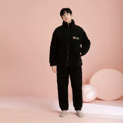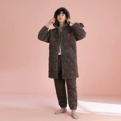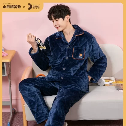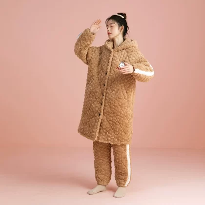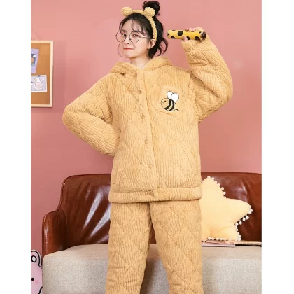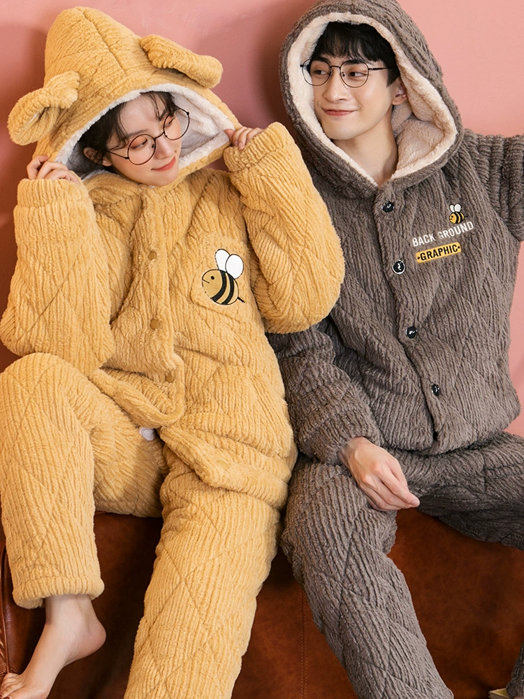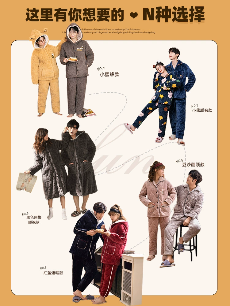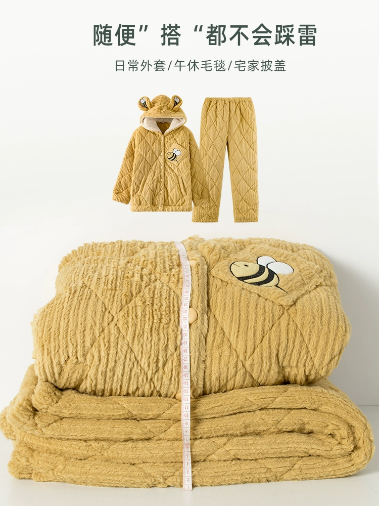 Pajamas for women three-layer quilted autumn and winter thickened plus velvet warm coral velvet men's home clothes winter couple lemon yellow