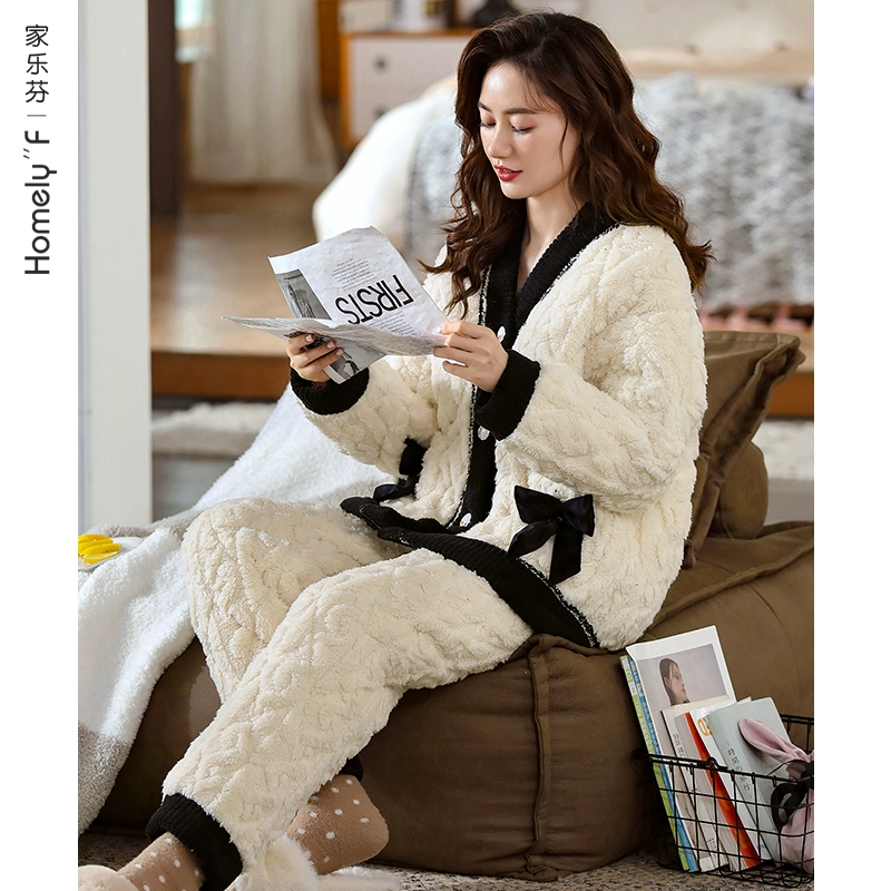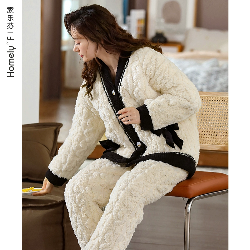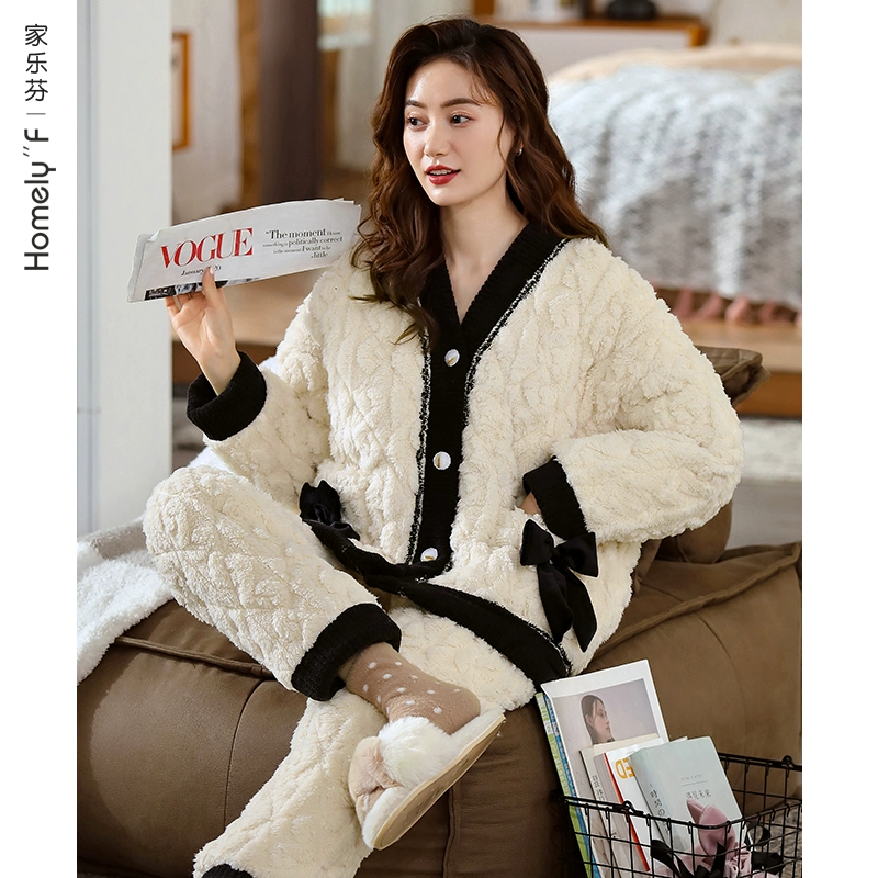 Pajamas for women winter three-layer thickened coral velvet quilted jacket flannel plus velvet warm home clothes autumn and winter style winter