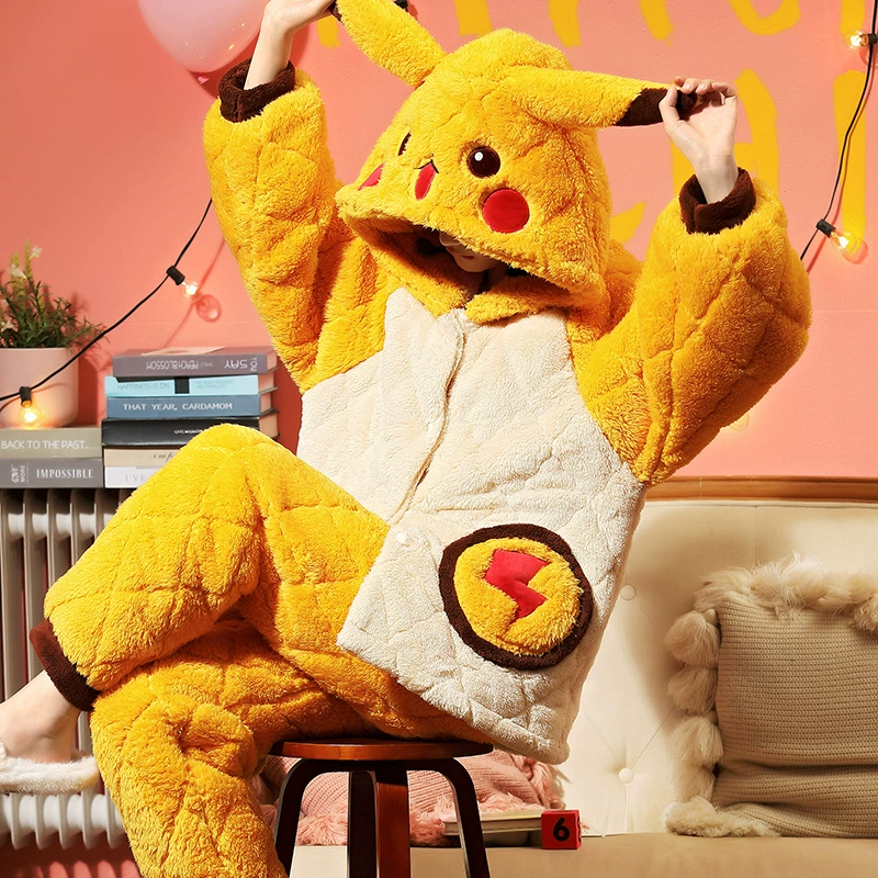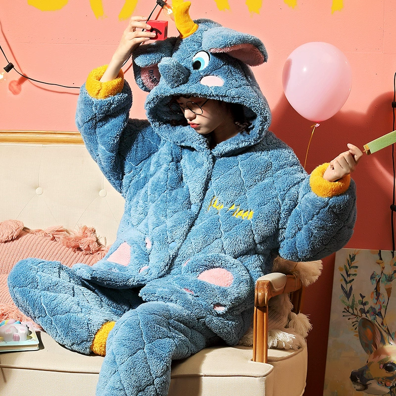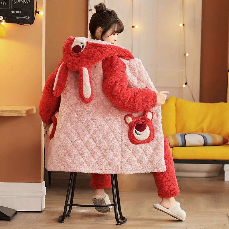 Pajamas for women winter warm three-layer coral velvet quilted plus velvet thickened winter cute flannel home wear set