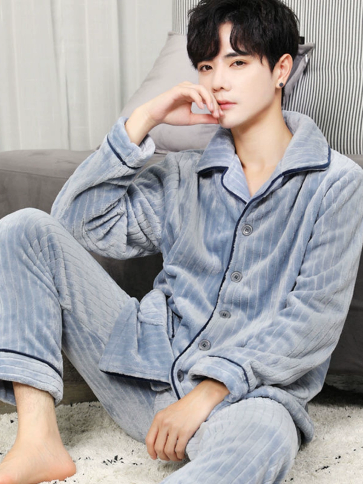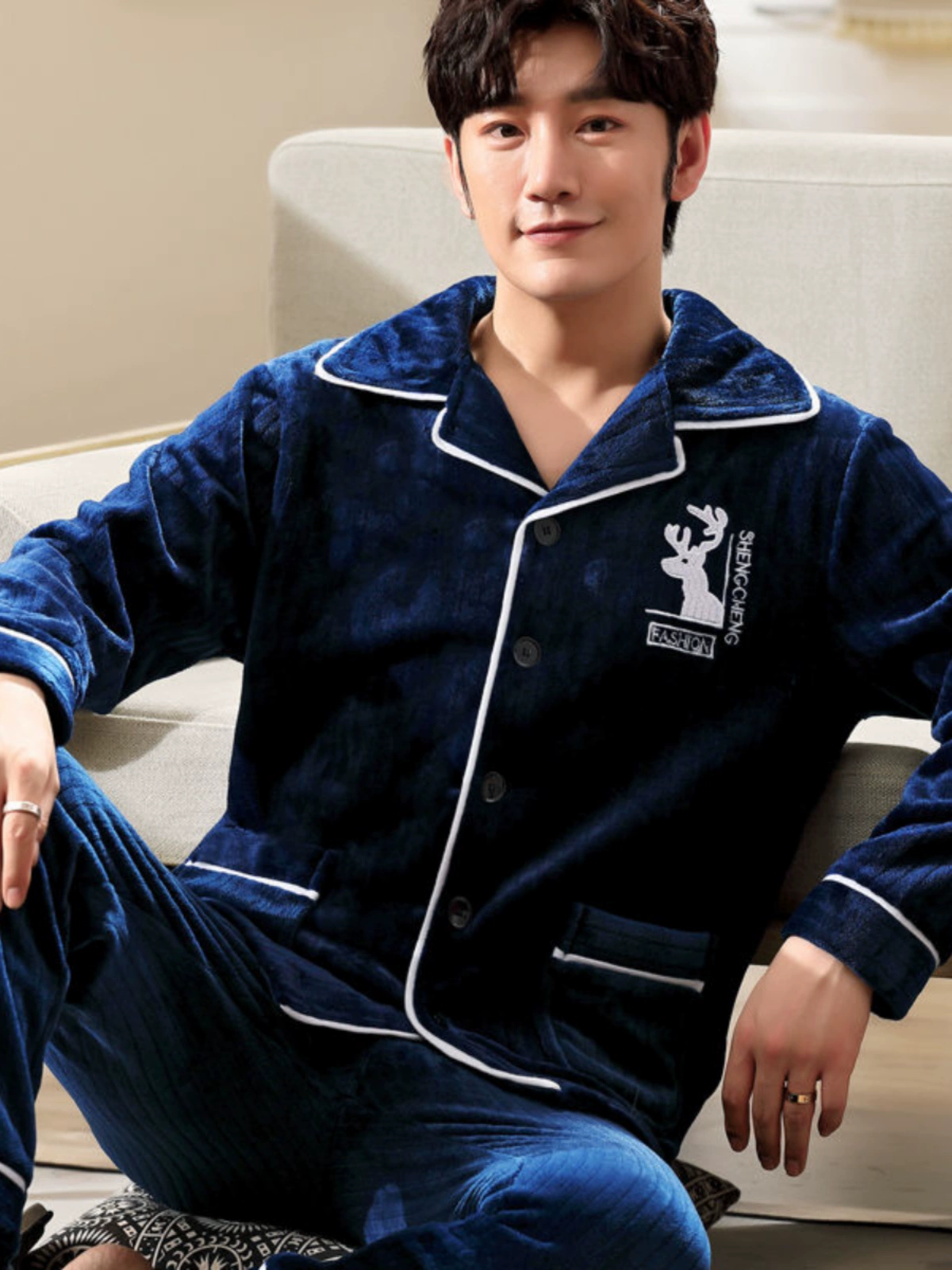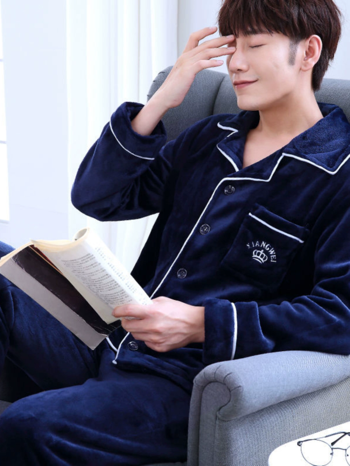 Pajamas men's winter thickened flannel home clothes coral velvet plus velvet warm suit cardigan can be worn outside in winter