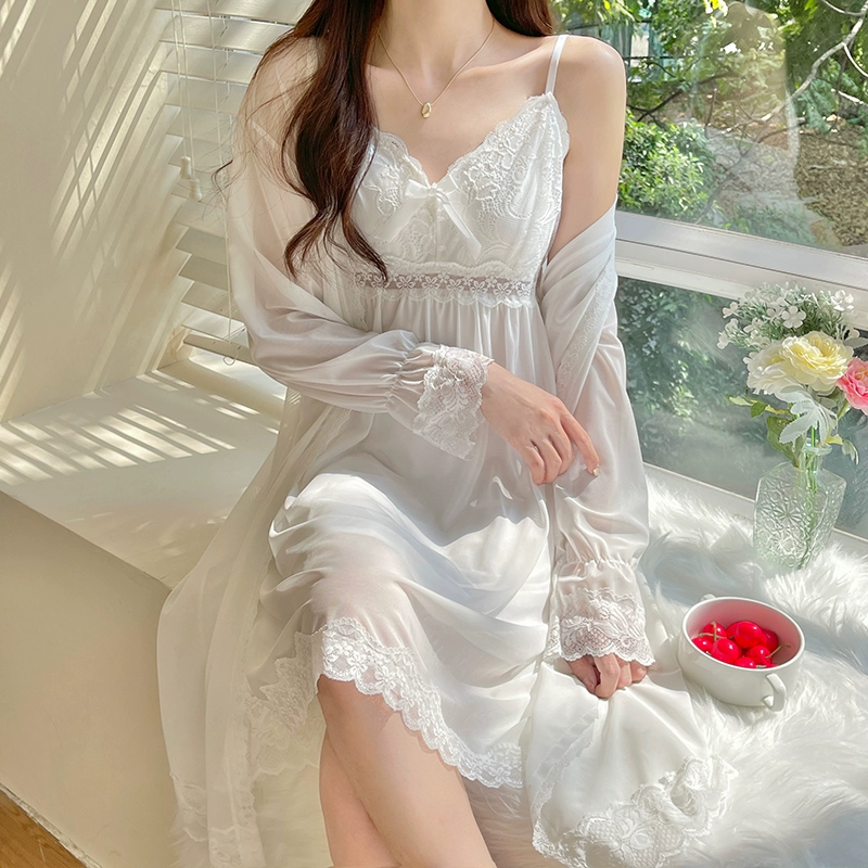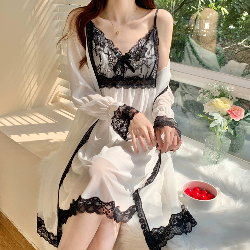 | nameOriginal | Pajamas with breast pads for women spring and summer long-sleeved sexy suspender nightgown modal mesh home wear nightgown two-piece set |