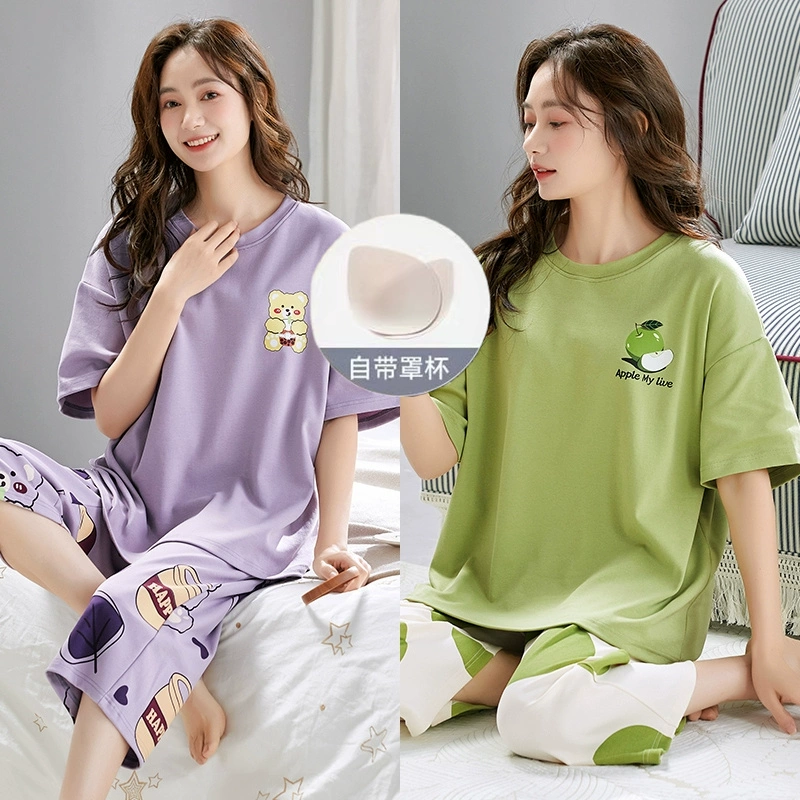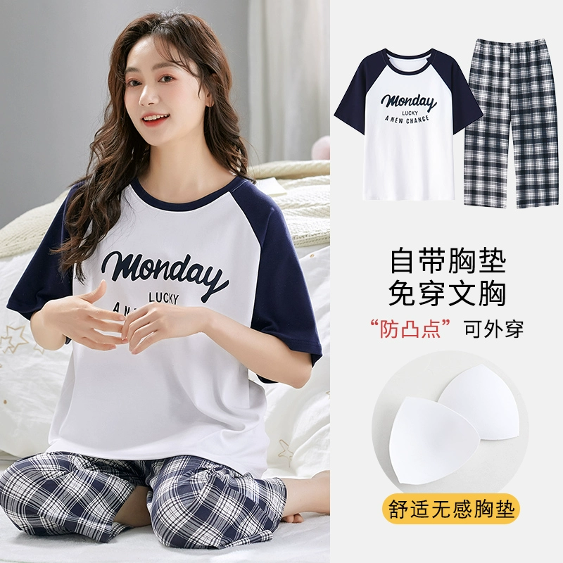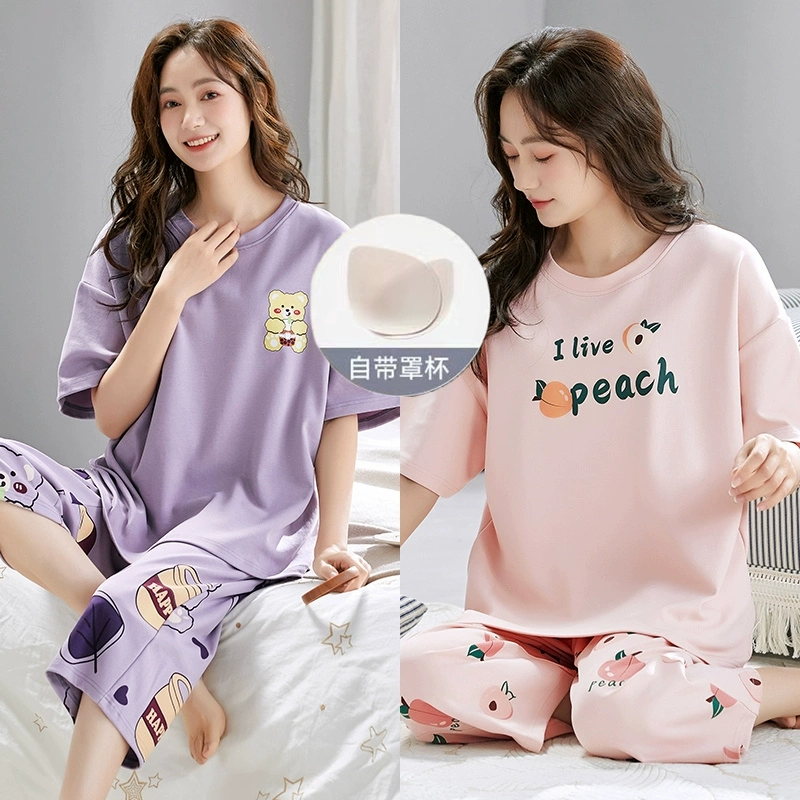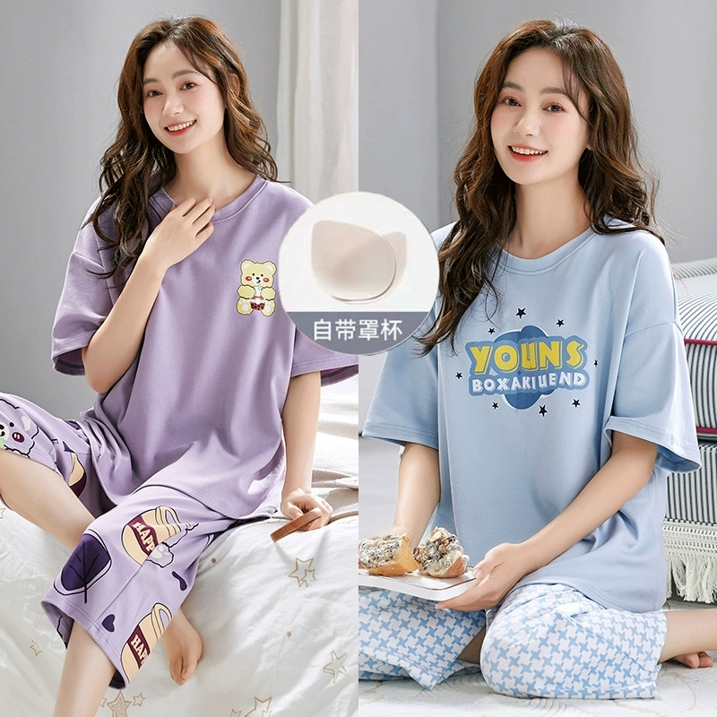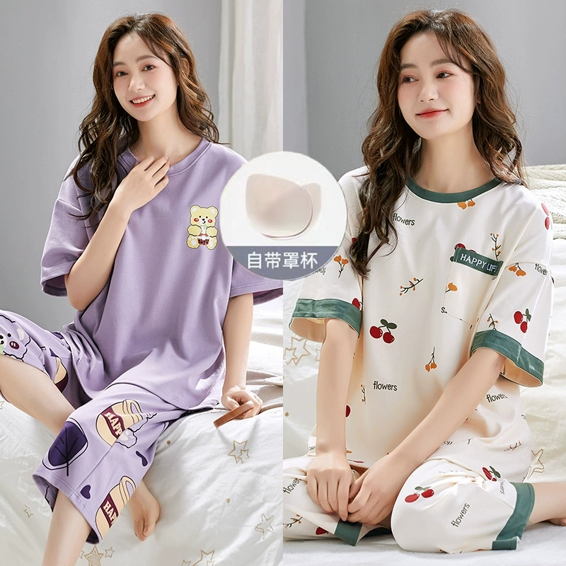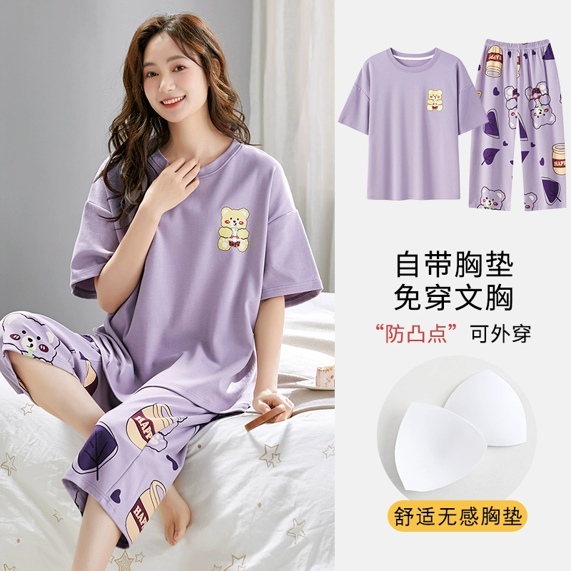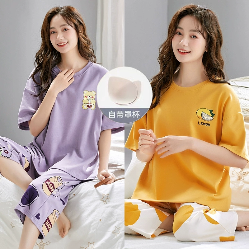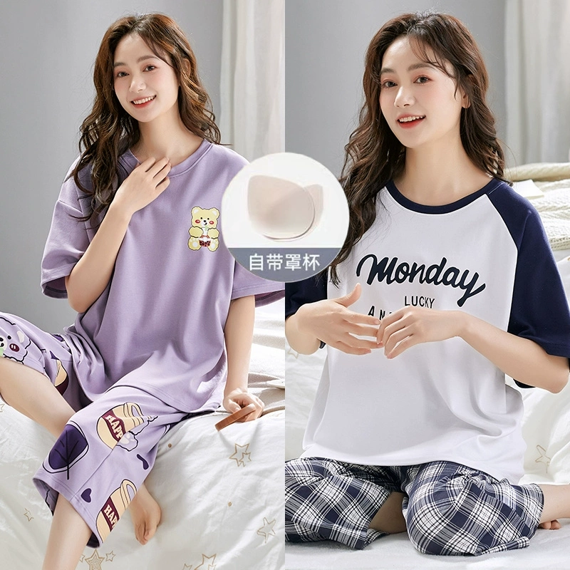 | nameOriginal | Pajamas with breast pads for women, summer pure cotton short-sleeved cropped pants two-piece set for fat mm, large size, pure cotton, thin style, can be worn outside |