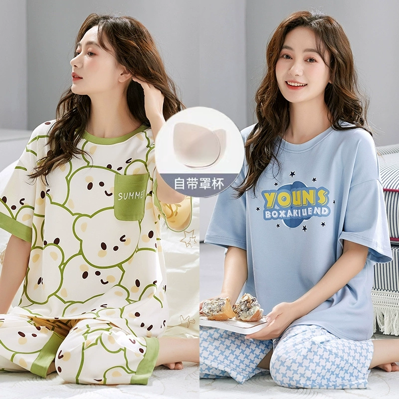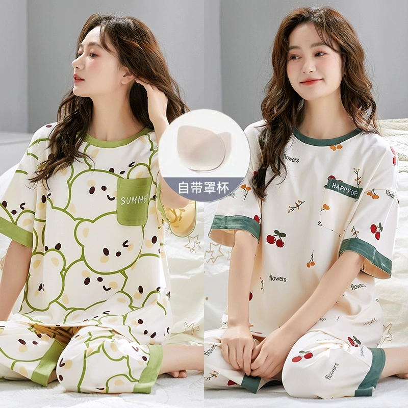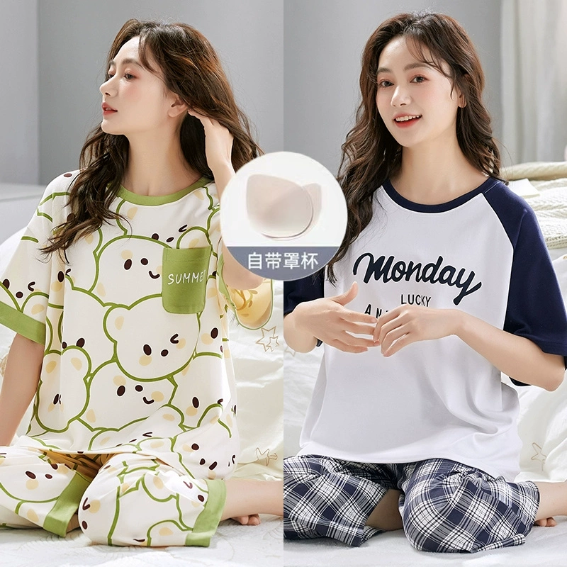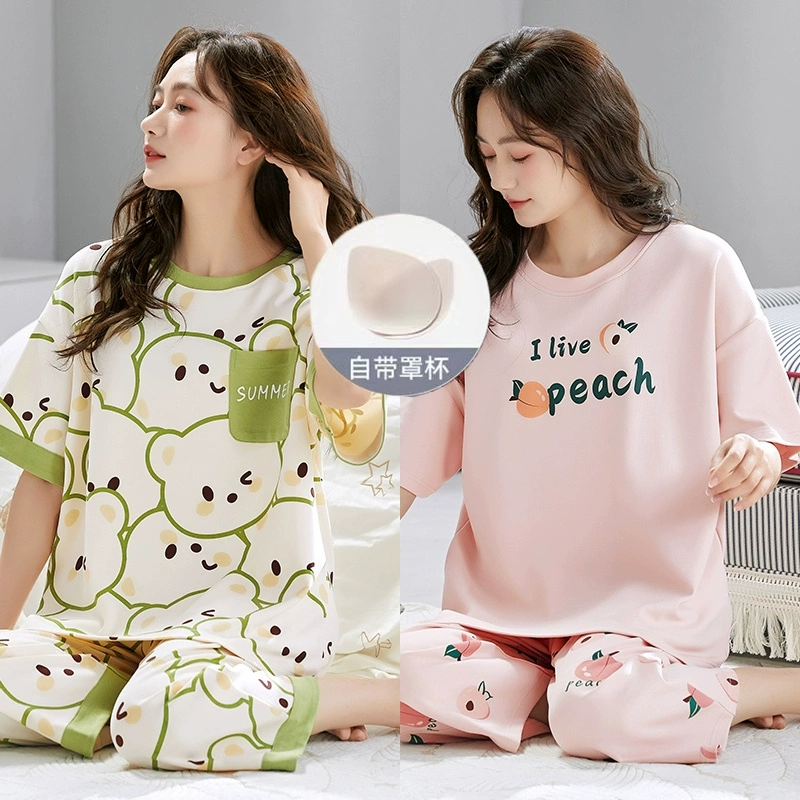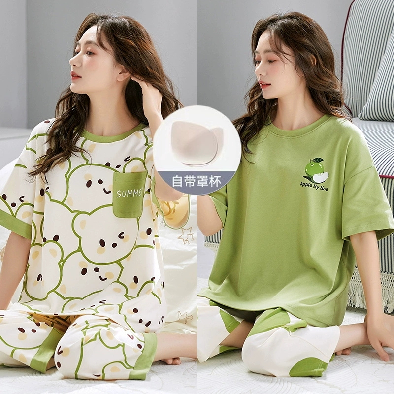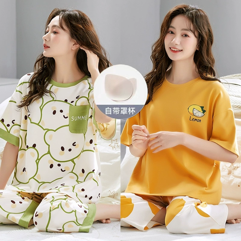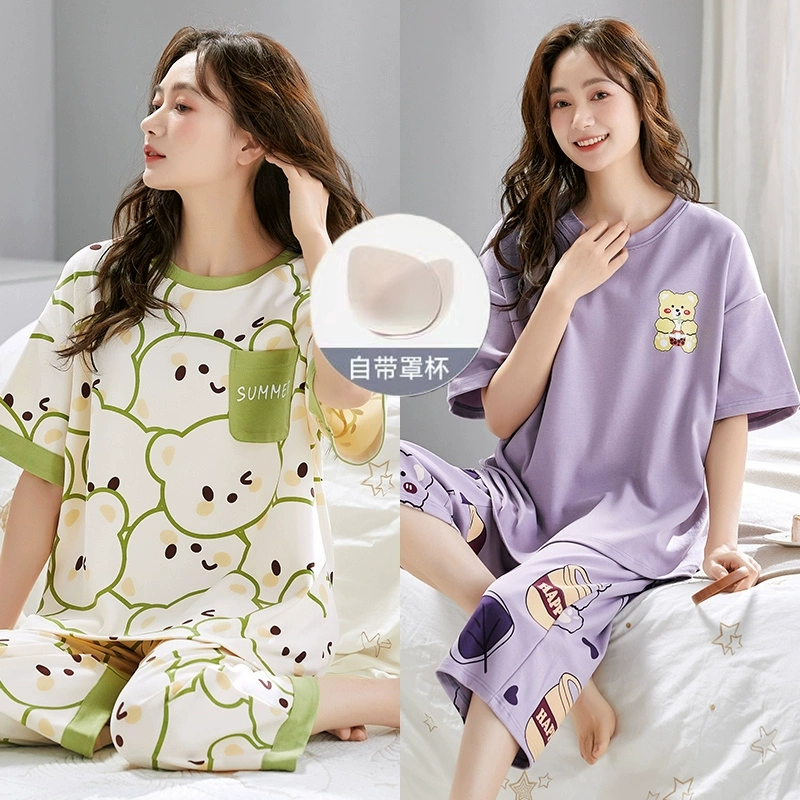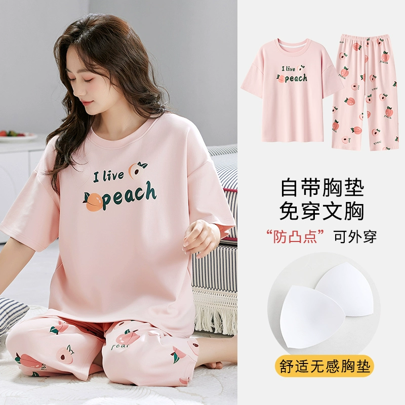 | nameOriginal | Pajamas with breast pads for women, summer pure cotton short-sleeved cropped pants two-piece set for fat mm, large size, pure cotton, thin style, can be worn outside |