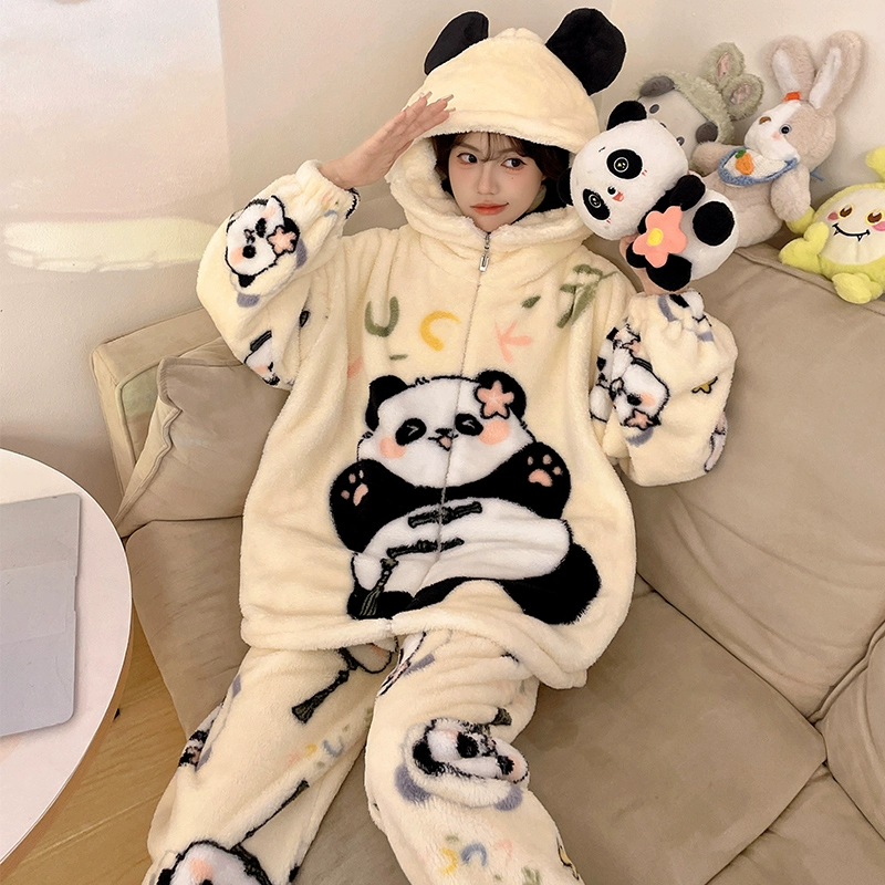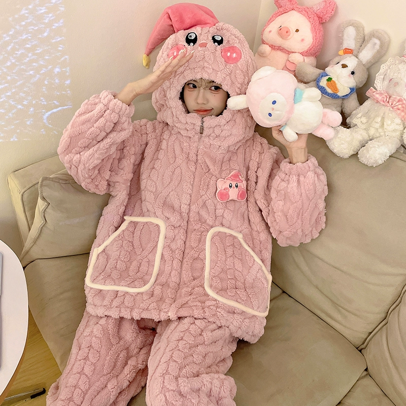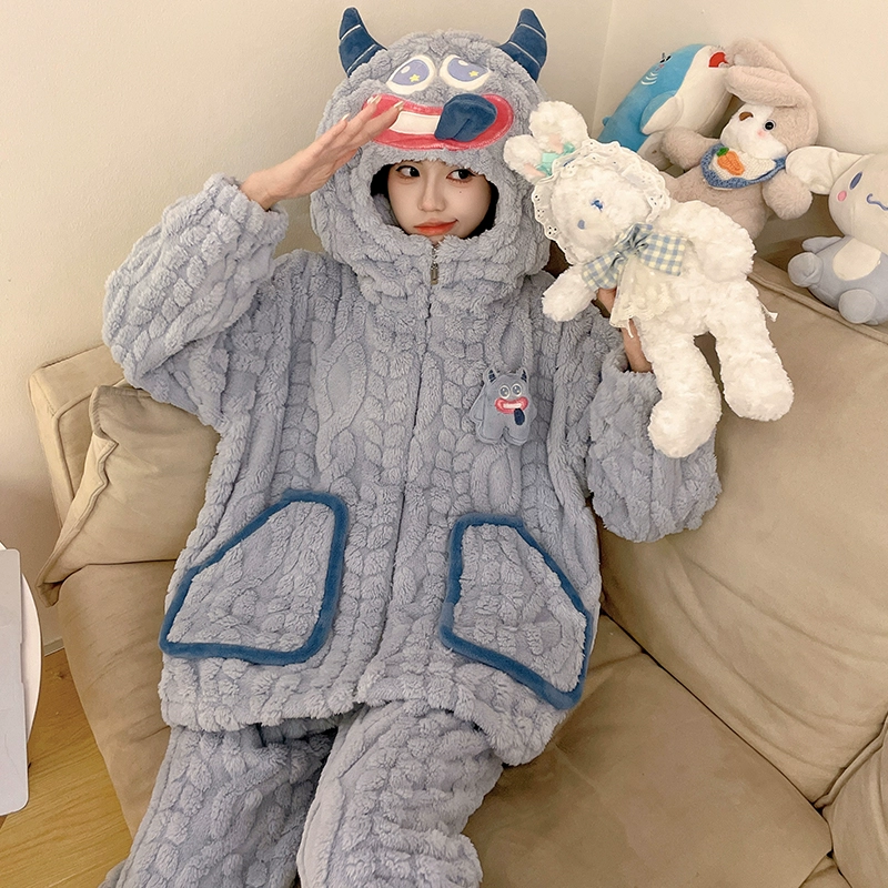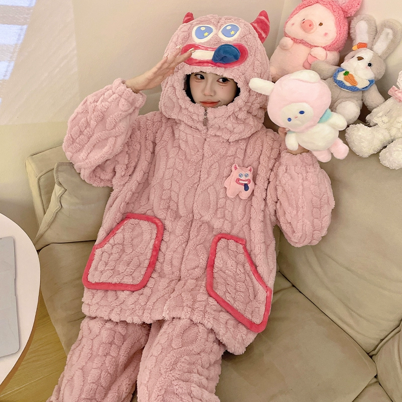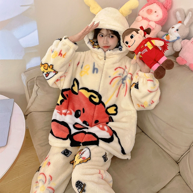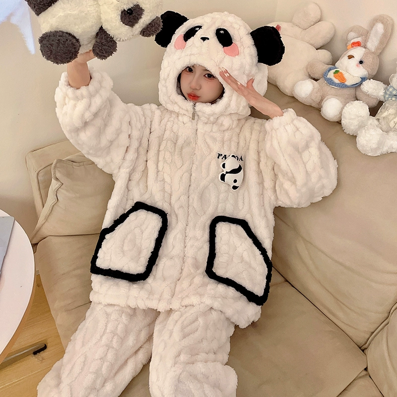 Pajamas women's coral velvet autumn and winter 2024 new pumpkin hooded thickened velvet winter flannel home clothes