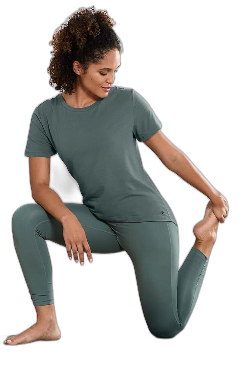 This product is suitable for women and is designed for training. It features a round neckline and short sleeves with a straight hem. The fabric is made of 92% cotton and 8% elastane, making it machine washable. The top is a solid green color and has a pullover closure. Please note that the product color may appear slightly different due to lighting or monitor settings.