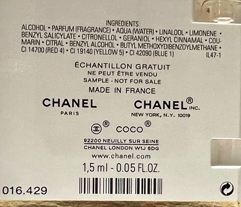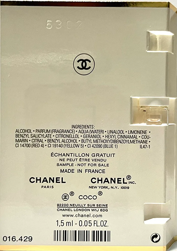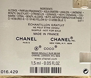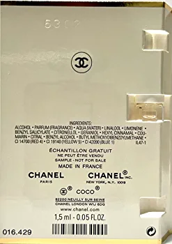 | descriptionOriginal | Description Sample Vial Travel 1.5 Ml/0.05 Oz Sparks of fresh and vibrant orange immediately awaken the senses. An intense new facet of the COCO MADEMOISELLE personality emerges to forge a powerful, deep, addictive fragrance that is irresistible in every way. A clear and sensual heart reveals the transparent accords of Grasse Jasmine and May Rose. The scent finally unfurls with the vibrant accents of Patchouli and Vetiver. |