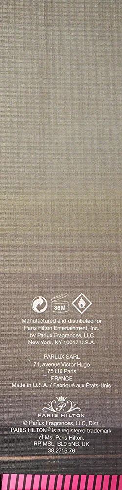Paris Hilton by Paris Hilton for Women – 3.4 Ounce EDP Spray. Ingredients: Alcohol Denat., Fragrance (Parfum), Water (Aqua), Linalool, Limonene, Hexyl Cinnamal, Alpha-Isomethyl Ionone, Benzyl Benzoate, Benzyl Salicylate, Citral, Geraniol.