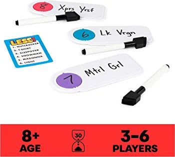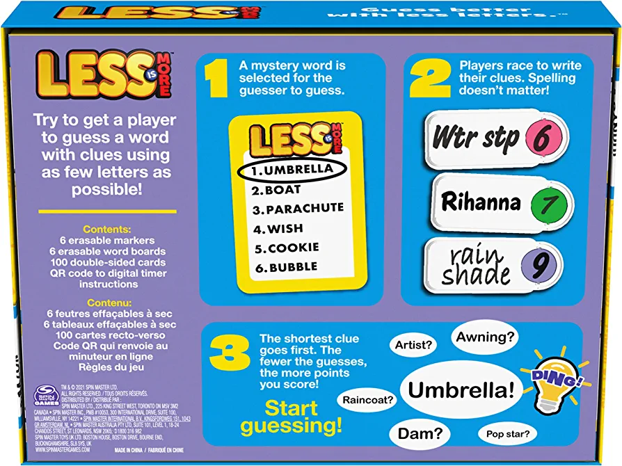 Introducing Less is More, the new family board game from Spin Master that challenges players to guess a mystery word using as few letters as possible. This hilarious card game is easy to learn and comes with a digital timer accessible through a QR code. Suitable for adults and kids ages 8 and up, this game requires 3-6 players to get started. Players race to write clues for the guesser, with the shortest clue going first. The fewer guesses it takes to guess the word, the more points you score. Use your word knowledge to win this fast-paced game that is perfect for holiday gatherings, happy hour with coworkers, or late-night parties. Give the gift of fun with Less is More, the perfect gift for any occasion.