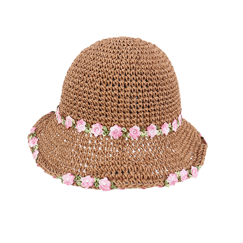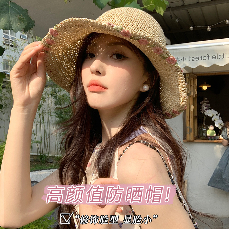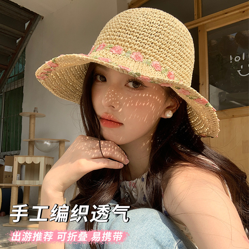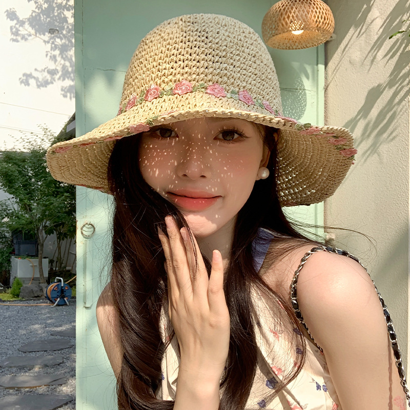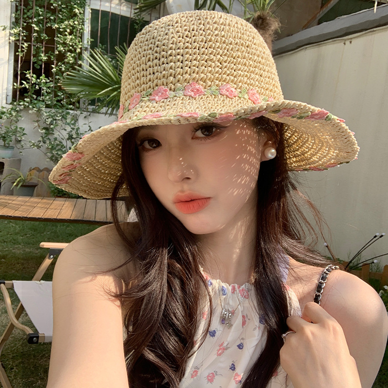Pastoral Style Fresh Flower Fisherman Straw Hat Women's Summer Big Hat Brim Seaside Holiday Sunshade Straw Fisherman Hat