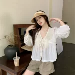 | nameOriginal | Pastoral style V-neck hollow lace-up doll loose shirt |