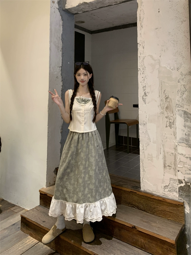 | nameOriginal | Patchwork plaid lace two-piece vest with elastic waist |