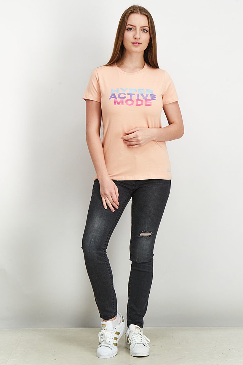 Care : Machine washable, Fit : Sportswear Fit, Size shown : International, Thickness : Light, Type of Sport : Training, Disclaimer : Product color may slightly vary due to photographic lighting sources or your monitor settings., Fabrics : 95% Cotton, 5% Spandex, Occasion : Sport, Pattern & Print : Graphic print, Sportswear Type : T-Shirt, Color Family : Peach,