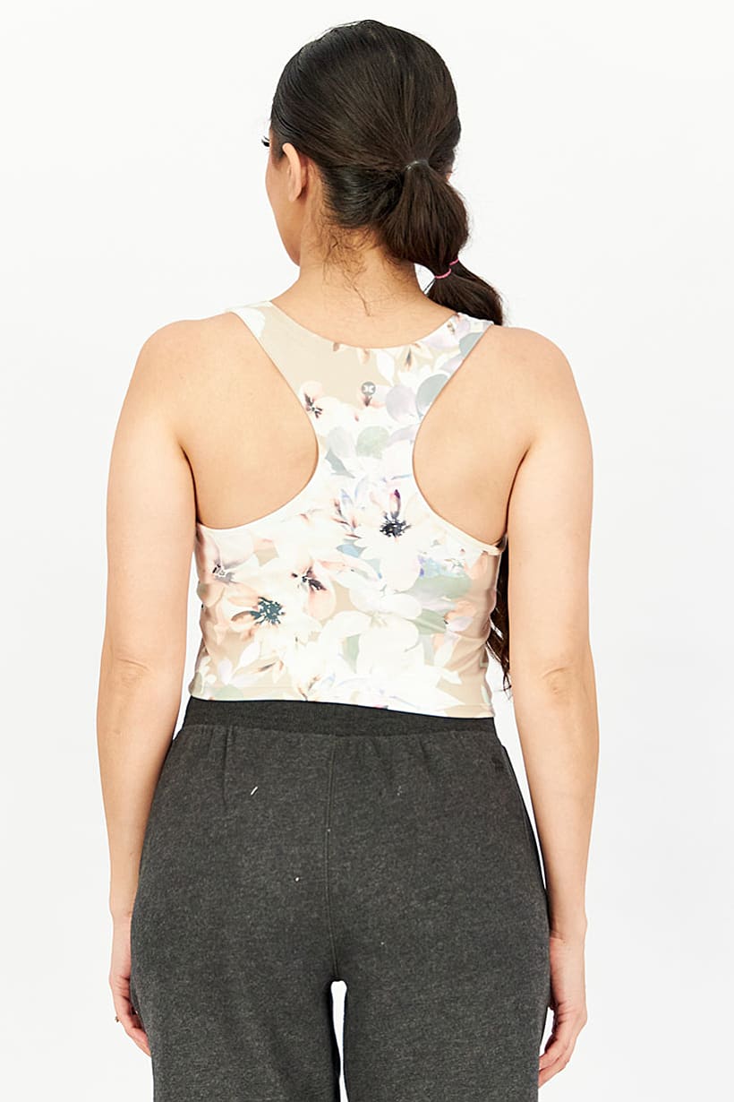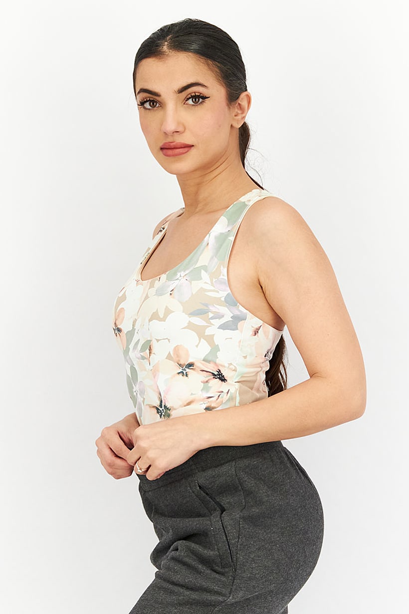 This product is suitable for machine washing and has a sportswear fit. The size shown is in US measurements and the thickness is light, making it ideal for training. Please note that the product color may vary slightly due to lighting or monitor settings. For hygiene reasons, we do not accept returns on lingerie, socks, undergarments, and swimwear. The fabric is made of 78% polyester and 22% spandex, and the product is suitable for sports occasions. The floral print adds a touch of style to this sports bra, which comes in a peach color family.