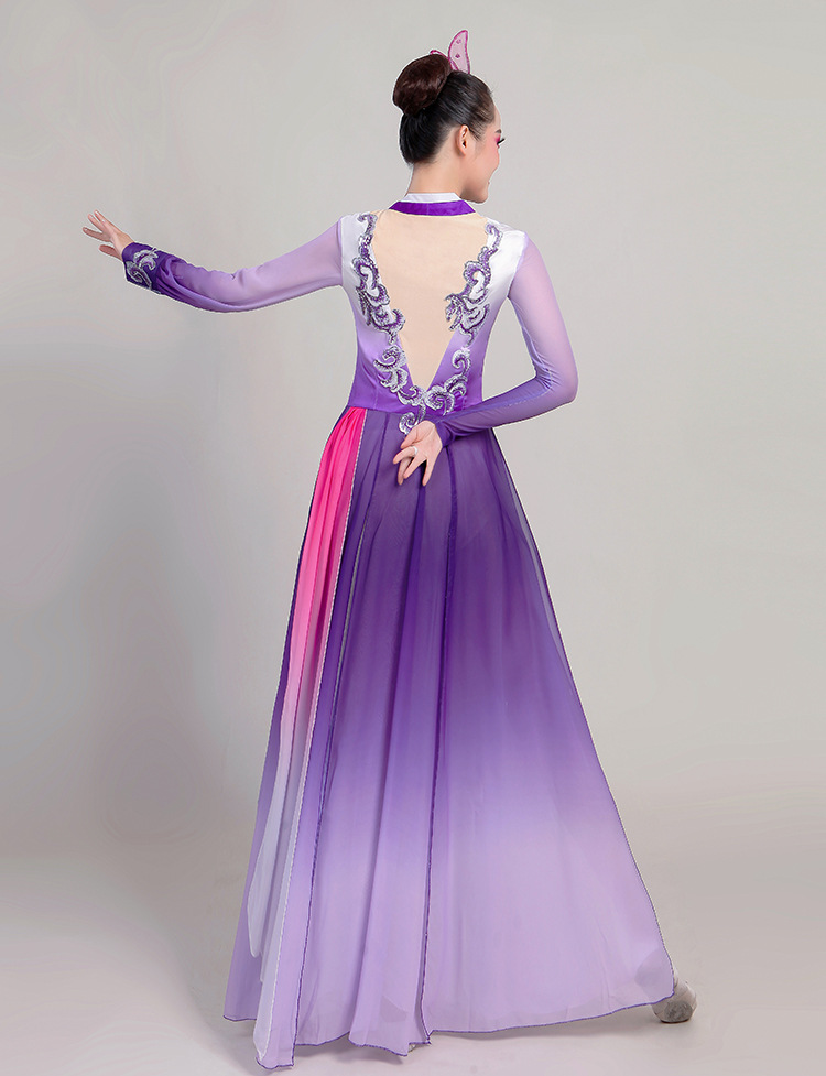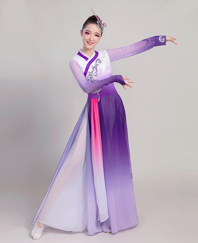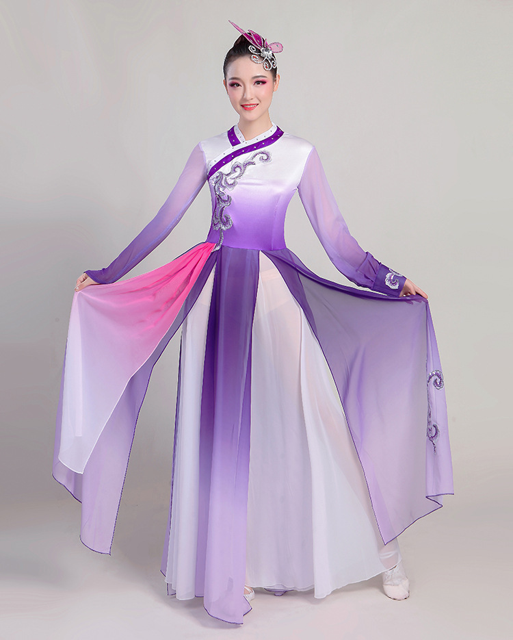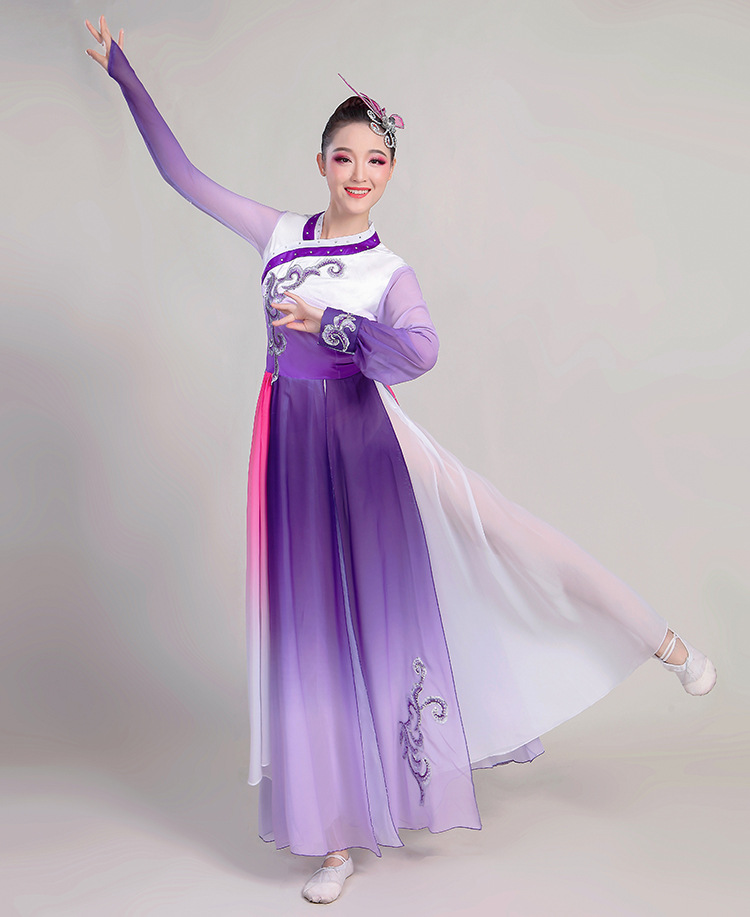 | nameOriginal | Peach Cup new classical dance water Cloud Dance performance costume female elegant ancient style group dance art exam performance costume purple |