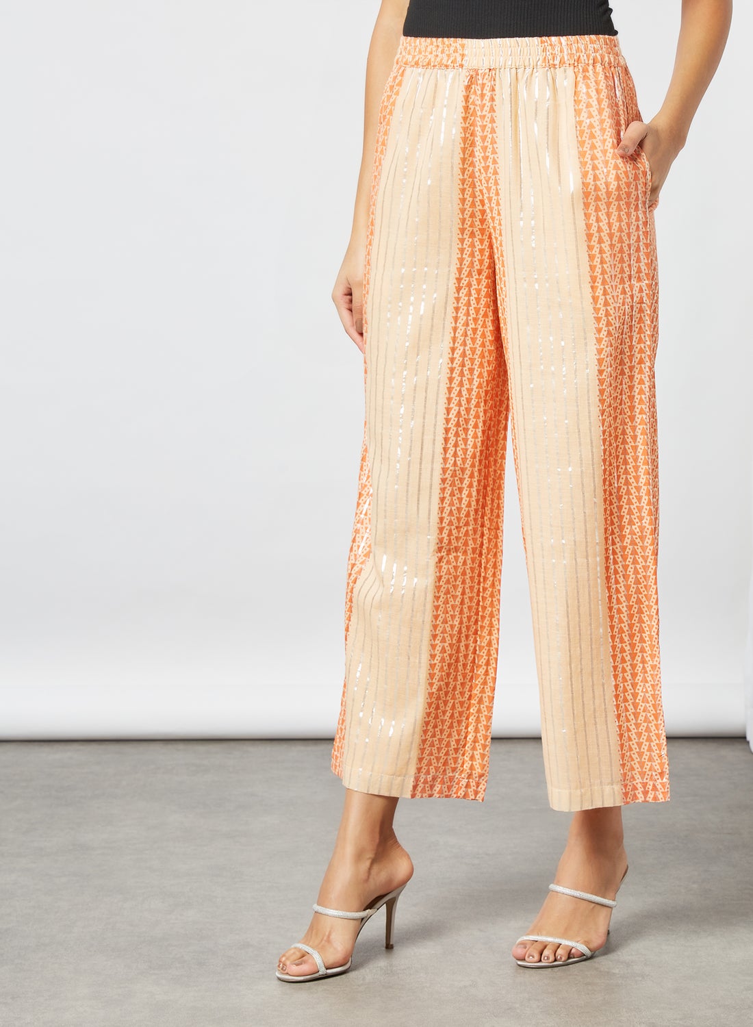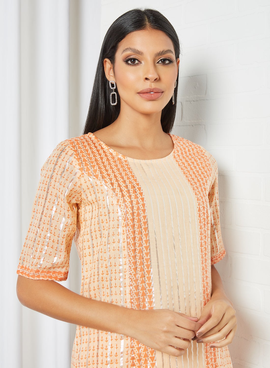 This product features a set of a long kurta and palazzo pants made from a lightweight and comfortable cotton blend fabric. The all-over design showcases a contrast geometric and foil print, while the kurta has a round neckline and short sleeves. The pants come with an elasticated waistband and dual side slip-in pockets for added convenience. To ensure proper care, please refer to the label instructions when washing.