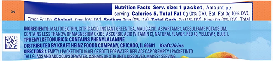 | nameOriginal | Crystal Light Sugar-Free Peach Mango Green Tea On-The-Go Powdered Drink Mix 10 Count |