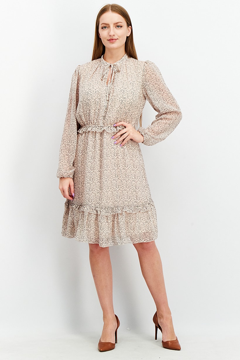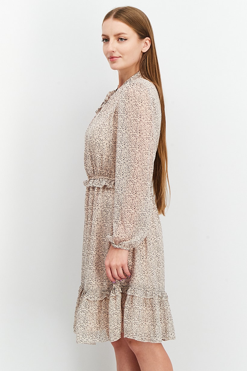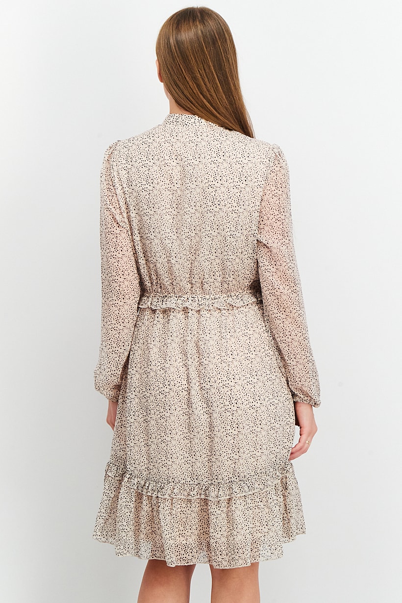 This product is easy to care for as it is machine washable. It features a mini dress style with a regular fit and a ruffle hem. The neckline and collar are tied, while the sleeves are long. Made from 100% polyester, this dress is perfect for casual occasions and features a playful polka dot pattern in a peach color family. It is a pullover style with no closures. The size shown is in EU measurements.